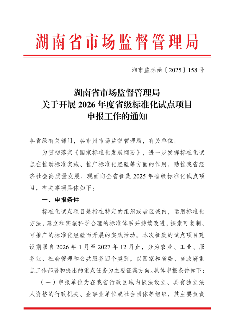 关于开展2026年度省级标准化试点项目申报工作的通知
