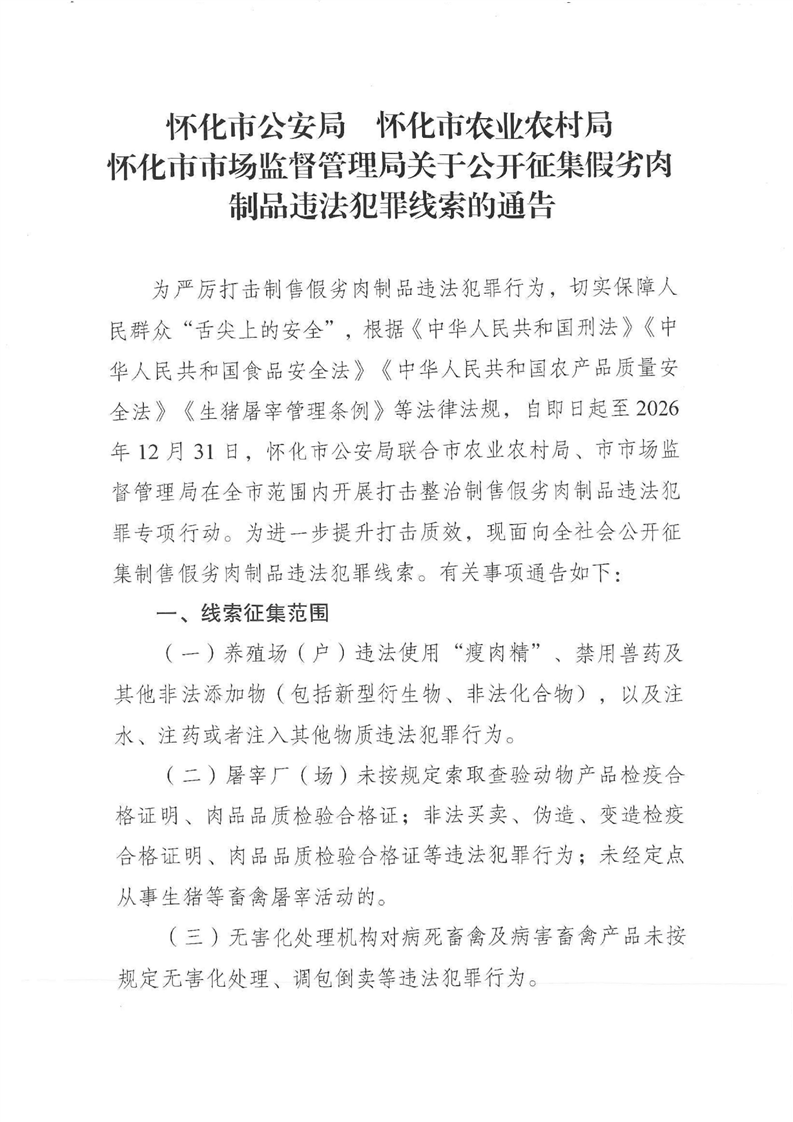 关于公开征集假劣肉制品违法犯罪线索的通告