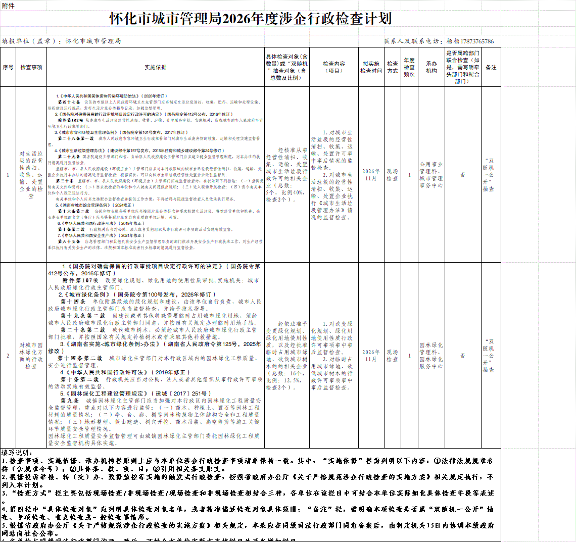 怀化市城市管理局2026年度涉企行政检查计划