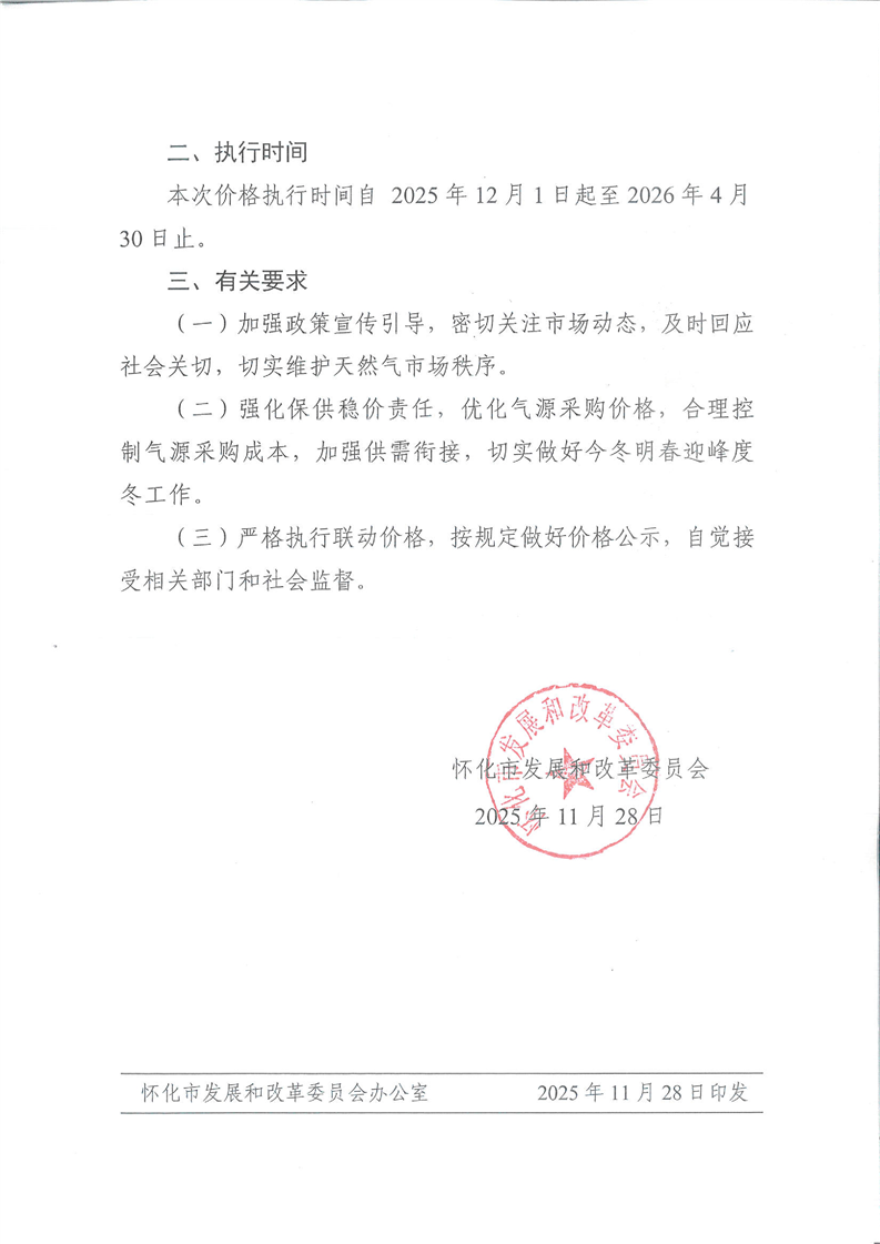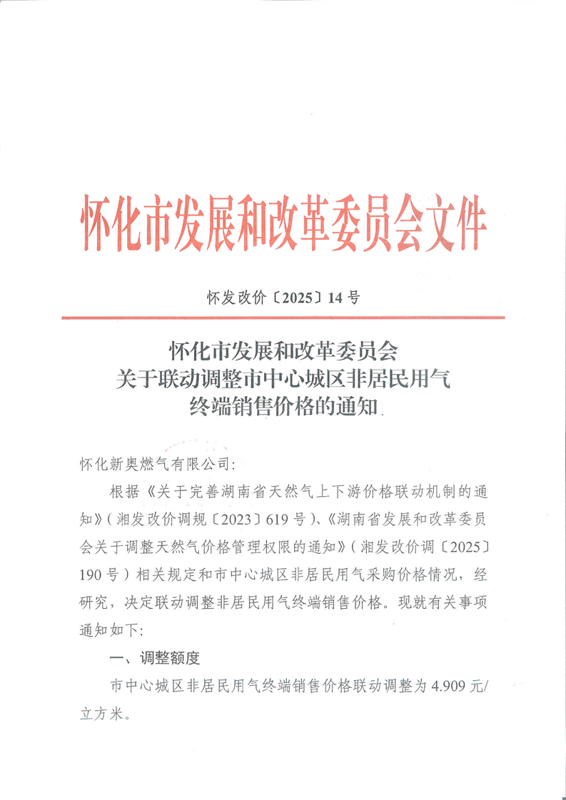 怀化市发展和改革委员会关于联动调整市中心城区非居民用气终端销售价格的通知