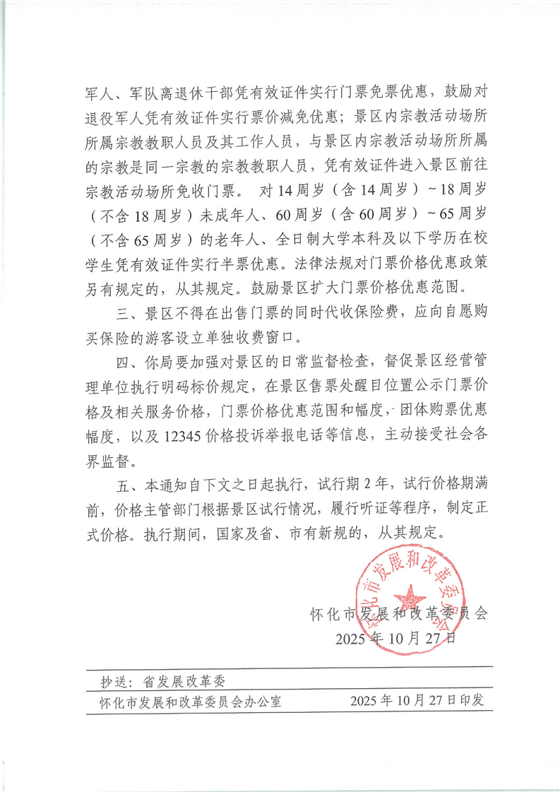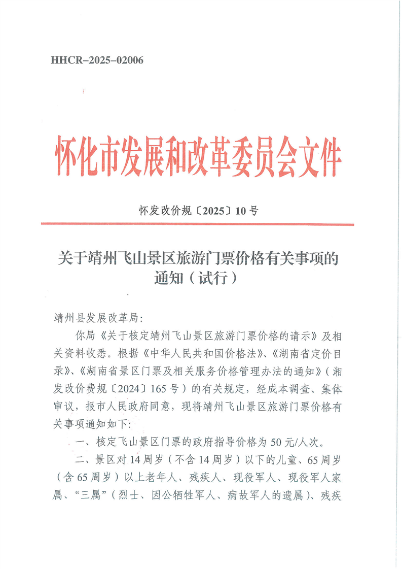 关于靖州飞山景区旅游门票价格有关事项的通知(试行)