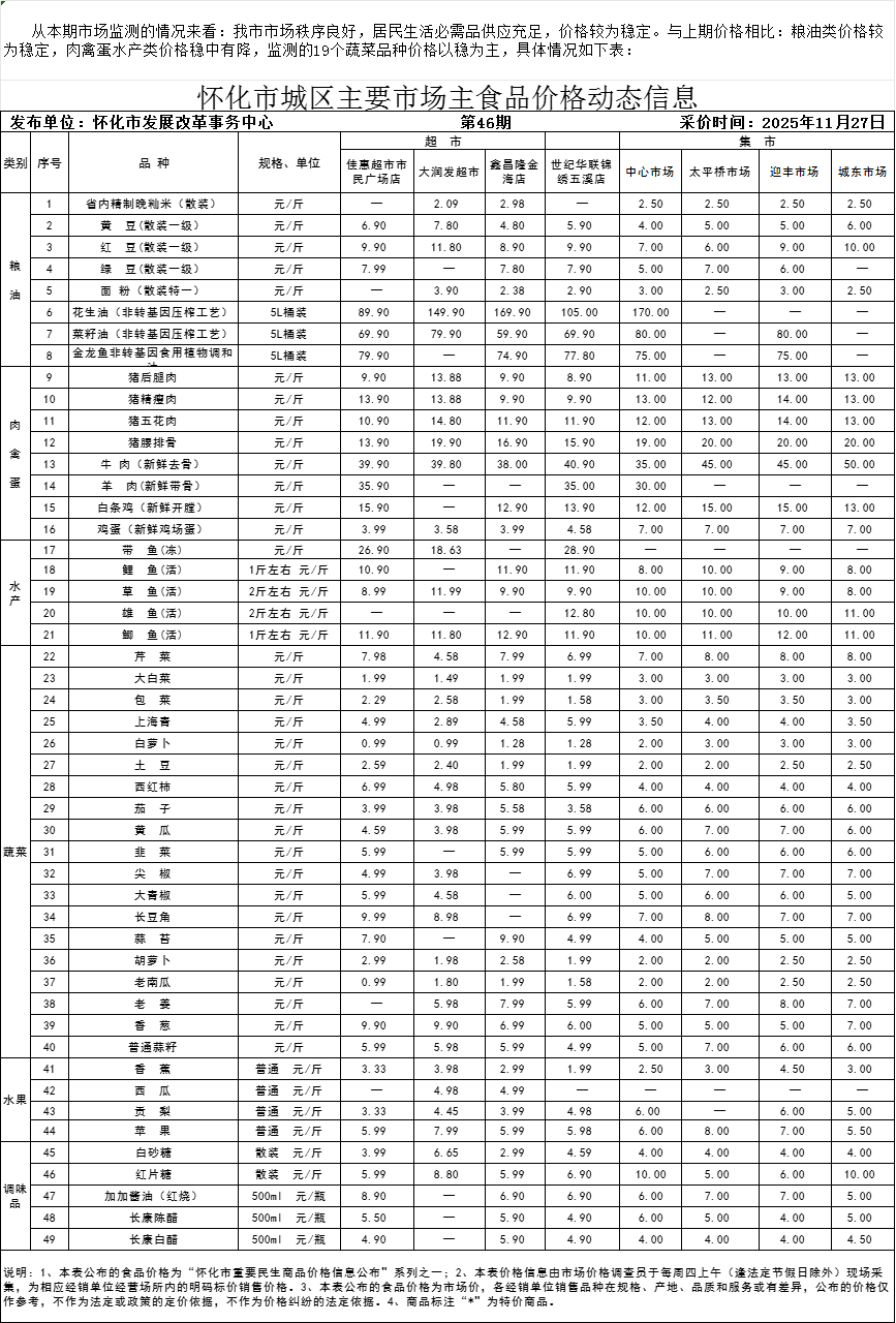 怀化市城区主要市场主食品价格动态信息2025年第46期