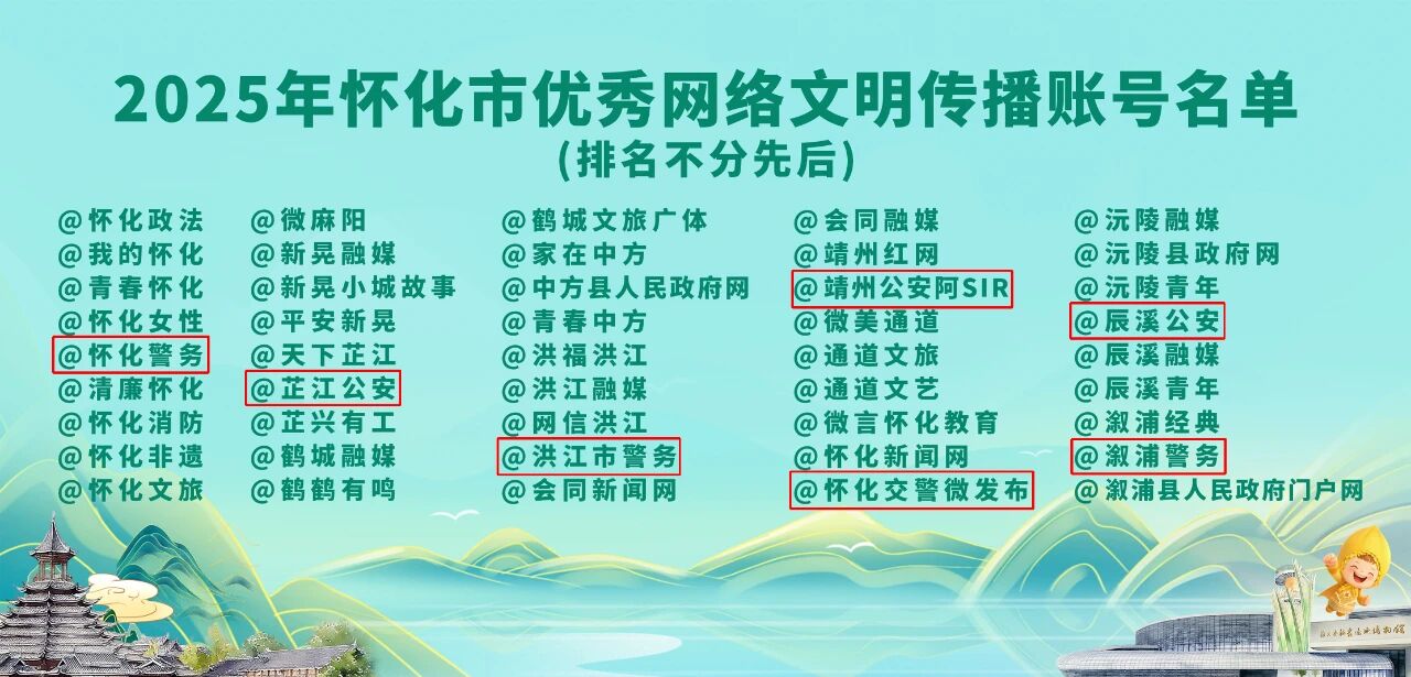 会上,市委宣传部分管日常工作的副部长王身祥宣读“怀化市网络文明传播大使”“优秀网络文明传播账号”“五溪好网民”名单,第五届湖南旅游发展大会网络传播“优秀组织”“优秀达人”名单,其中怀化公安系统7个账号上榜,名单如下: