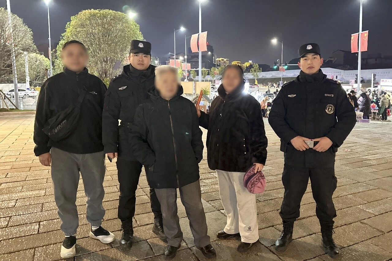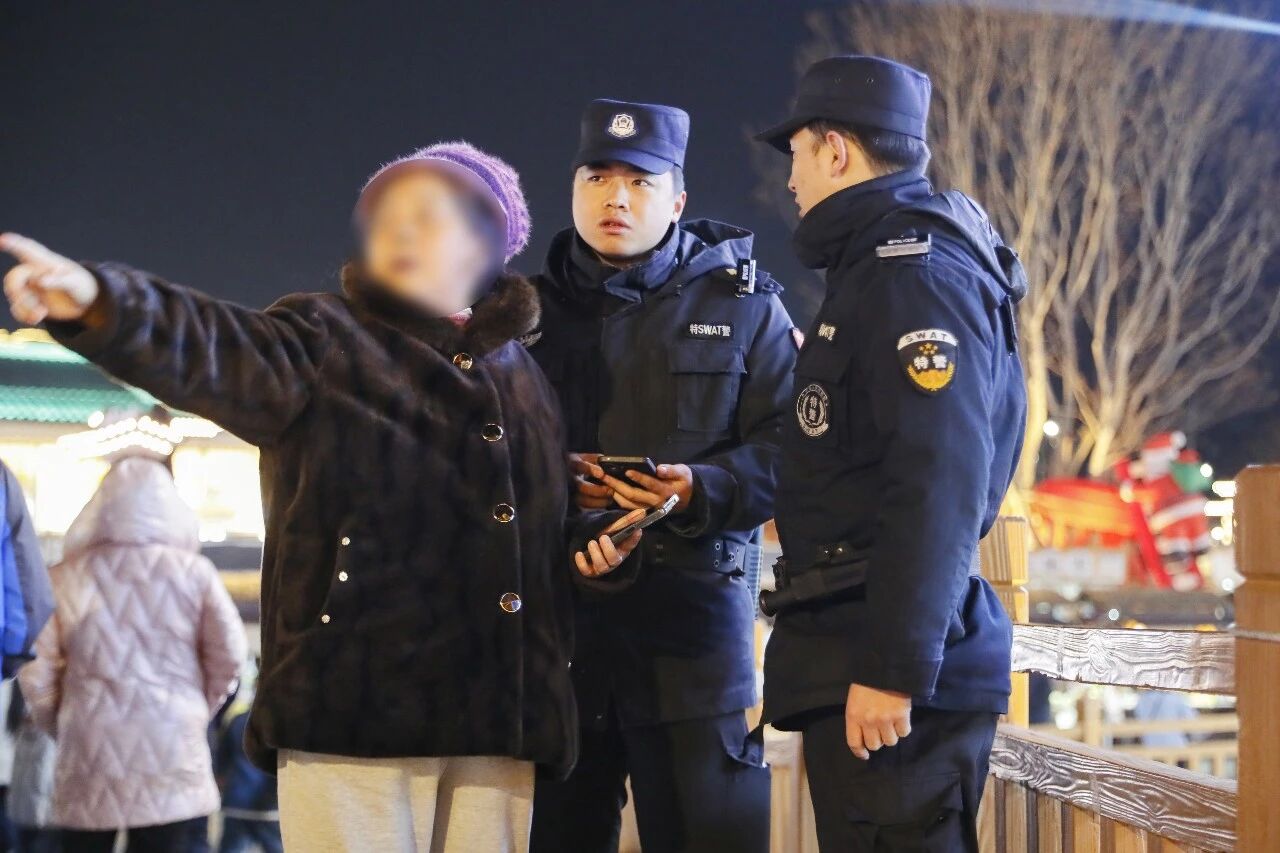 1月1日晚,鹤城区榆树湾景区张灯结彩、人头攒动,吸引众多市民前来游玩。李奶奶与家人也到场欣赏夜景,却因现场人流密集,不慎与老伴走散。焦急寻找无果后,她向现场执勤特警求助。