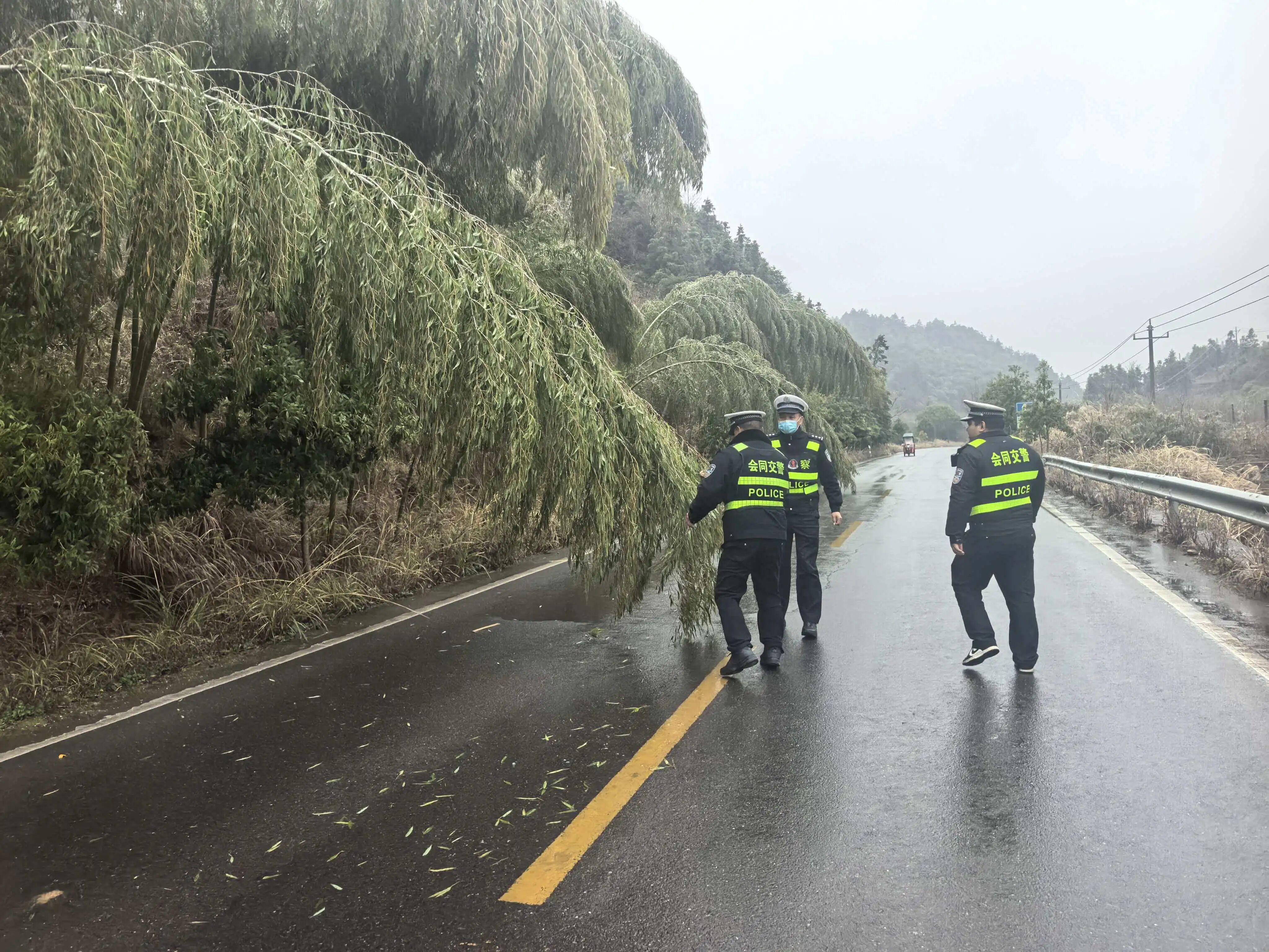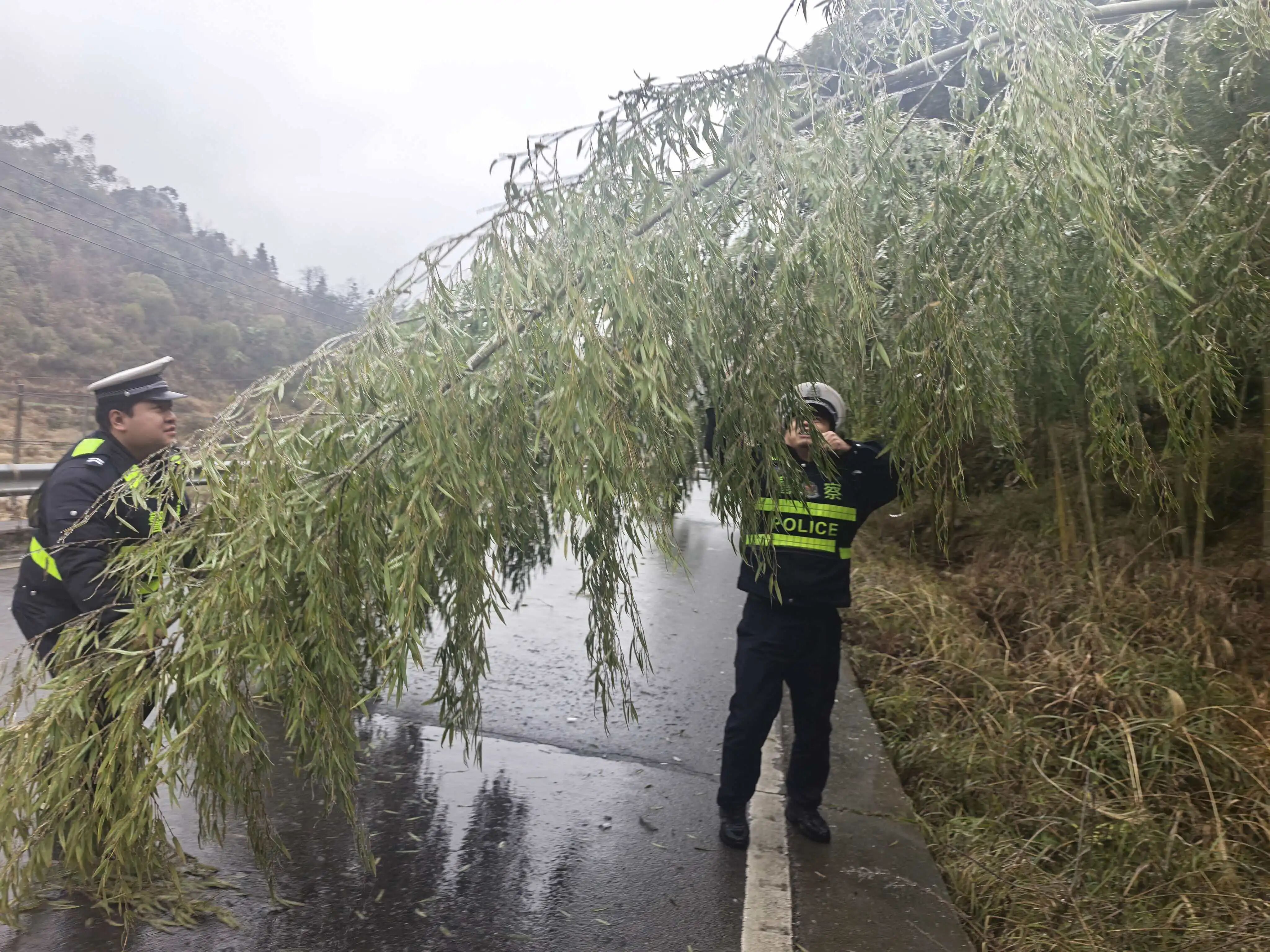 1月20日,会同县公安局交管大队堡子交管中队执勤人员在省道S556金龙岩脚村路段巡逻时,发现道路旁竹子因结冰倒伏倾斜至路面,形成交通安全隐患,妨碍车辆正常通行。执勤人员当即下车处置,对倾斜竹子进行清理,及时消除安全隐患。