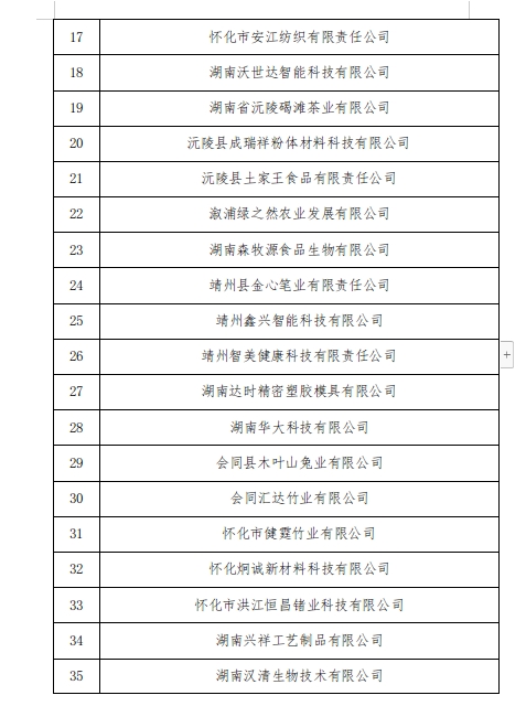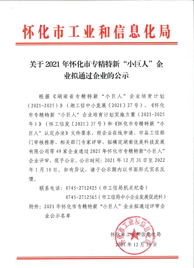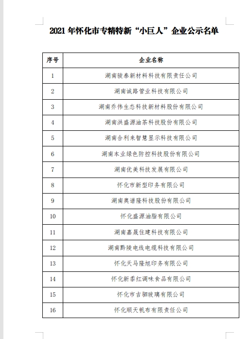 关于2021年怀化市专精特新“小巨人”企业拟通过企业的公示