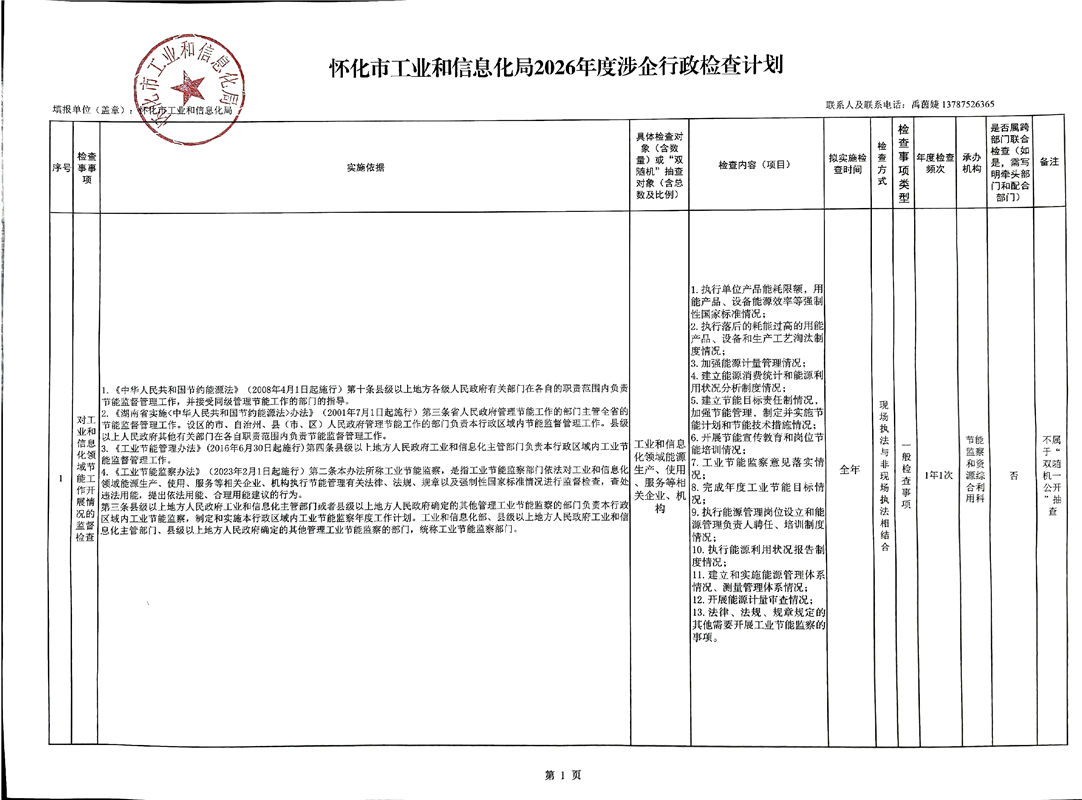 怀化市工业和信息化局2026年度涉企行政检查计划