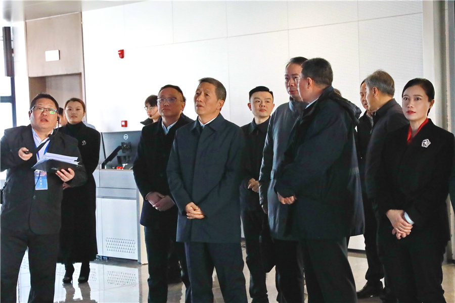 (1月23日上午,怀化国际陆港多式联运中心启用暨铁路专用线班列首发活动举行。图为市委书记许忠建,市委副书记、市长韦朝晖考察怀化国际陆港多式联运中心智慧调度中心。怀化日报全媒体记者 彭军 摄)