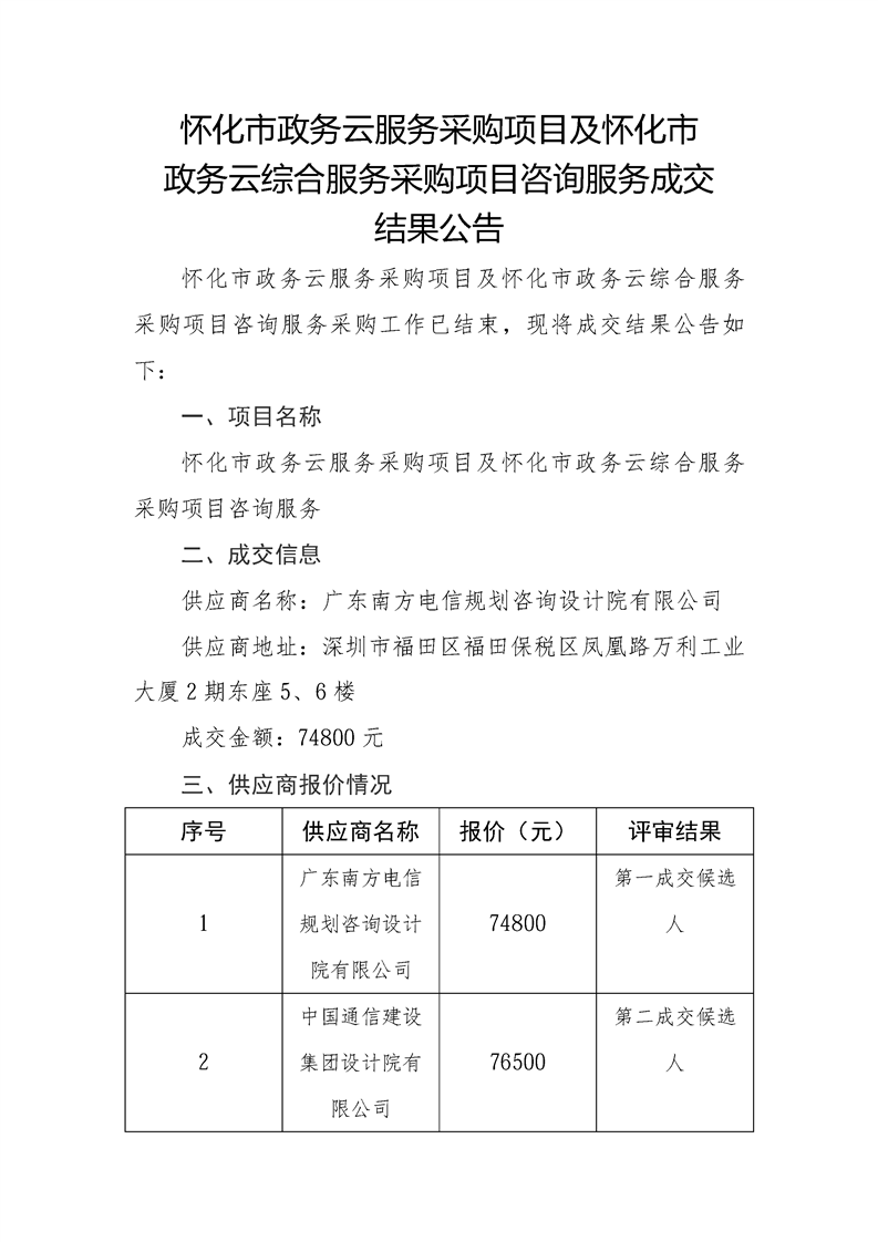 怀化市政务云服务采购项目及怀化市政务云综合服务采购项目咨询服务成交结果公告