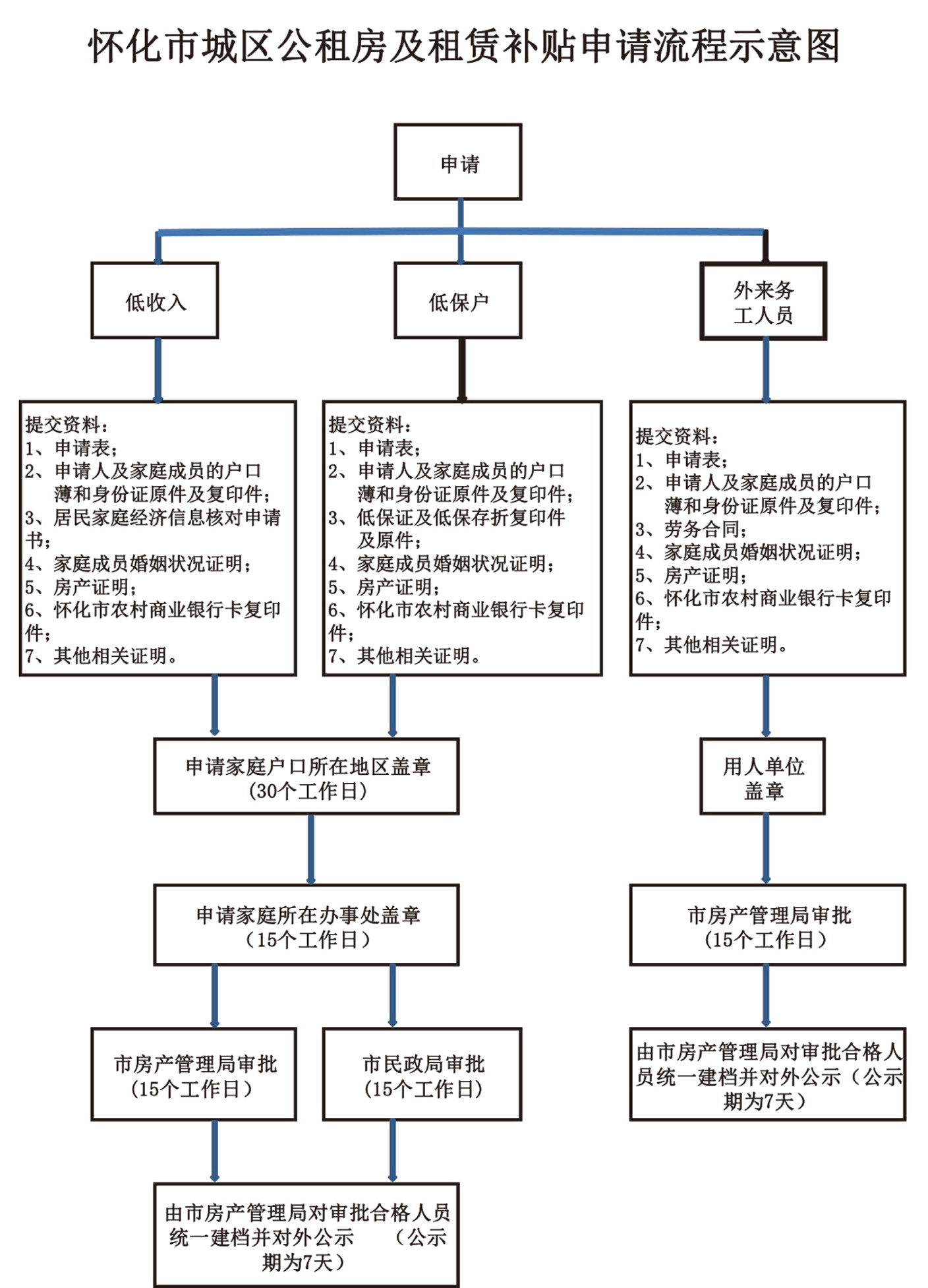 以上申请流程是根据怀政办发[2014]13号《怀化市公共租赁住房和廉租住房并轨运行管理办法》的通知的第四章第十五条规定办理。