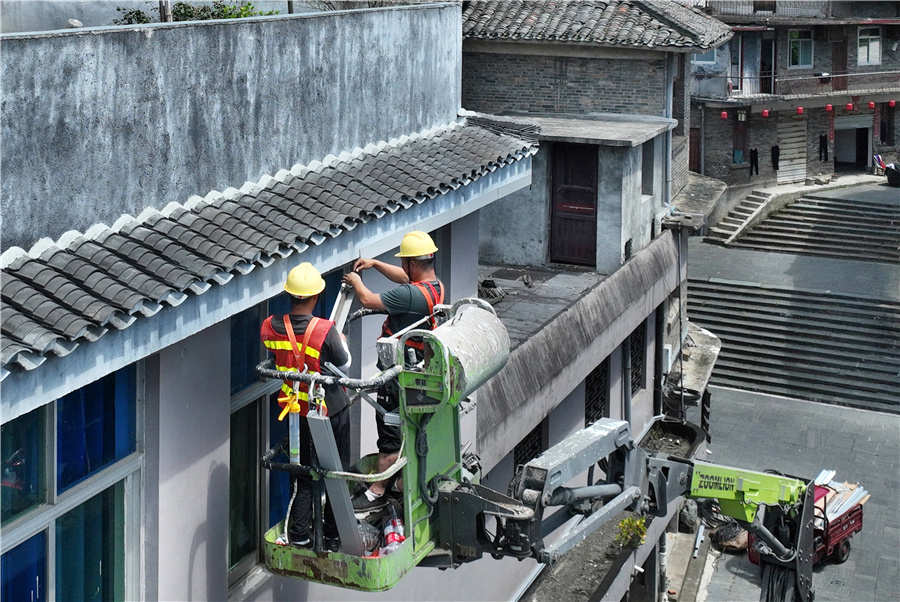 7月16日,洪江市黔阳古城亮化项目现场,工人们正在安装古城内建筑轮廓灯。为全力办好第三届怀化市旅游发展大会,该市积极推进50余个重点项目建设,紧盯建设任务和时间节点,抢抓施工黄金期,确保高标准、高质量完成项目建设任务。