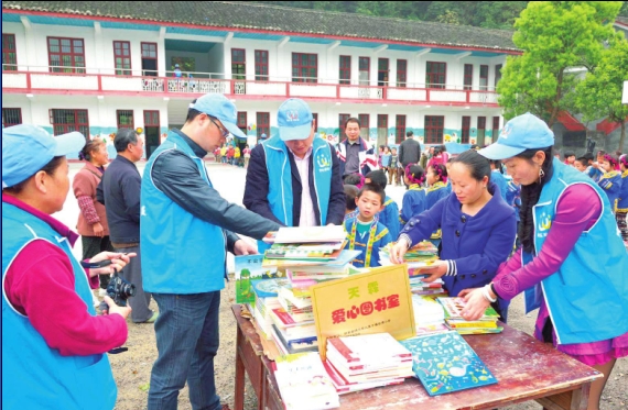 4月14日,在靖州大堡子学区岩湾教学点,靖州快乐爱心公益协会的义工与学校老师一起,将海外中国教育基金赠送的图书拆封盖章,再由学生传递到学校图书室。海外中国教育基金会是一个非盈利性组织,其使命是筹集资金援助中国贫困地区的教育事业。