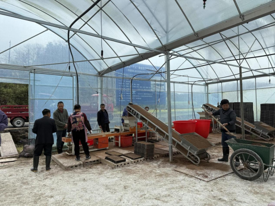 (育秧基地工人忙碌作业中)