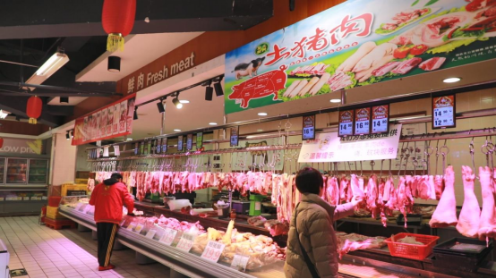 超市里,生鲜摊位前的市民们有序挑选着当天的猪肉产品,查看肥瘦,询问部位和价格。工作人员则根据顾客需求切割、称重。一片安心、祥和的民生图景。