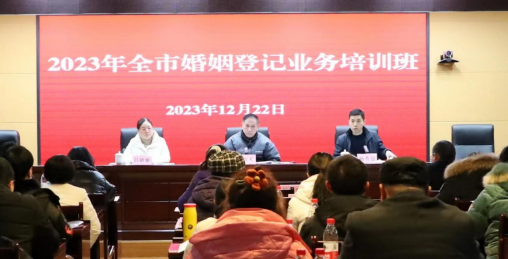 2023年12月22日,怀化市民政局举办2023全市婚姻登记业务培训班,深入学习习近平总书记关于婚姻家庭建设的重要论述,着力提升婚姻登记管理服务水平,积极回应人民群众对婚姻家庭的期盼。市民政局二级调研员姚茂术出席开班仪式并讲话。沅陵县、会同县分别介绍婚俗改革试点经验。市民政事务中心副主任彭麟雅就婚育“一件事一次办”和婚姻登记实务作专题辅导。