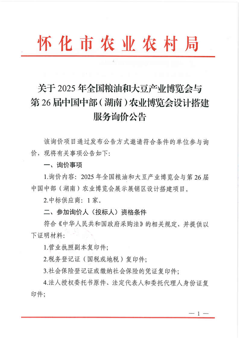 关于2025年全国粮油和大豆产业博览会与第26届中国中部(湖南)农业博览会设计搭建服务询价公告