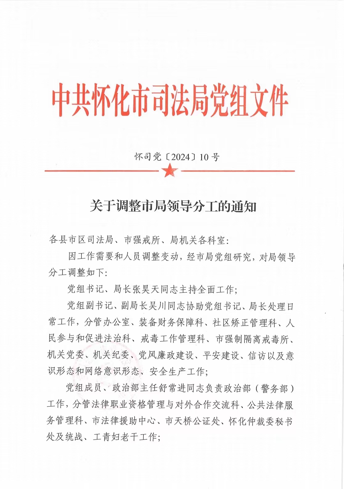关于调整市局领导分工的通知