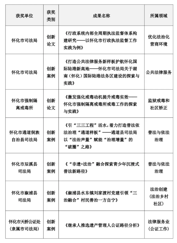 本次获奖成果紧密结合怀化地域特点与法治建设实际,既有服务国家战略的 “大动作”,也有贴近群众生活的 “微创新”,形成了一批可复制、可推广的 “怀化经验”。
