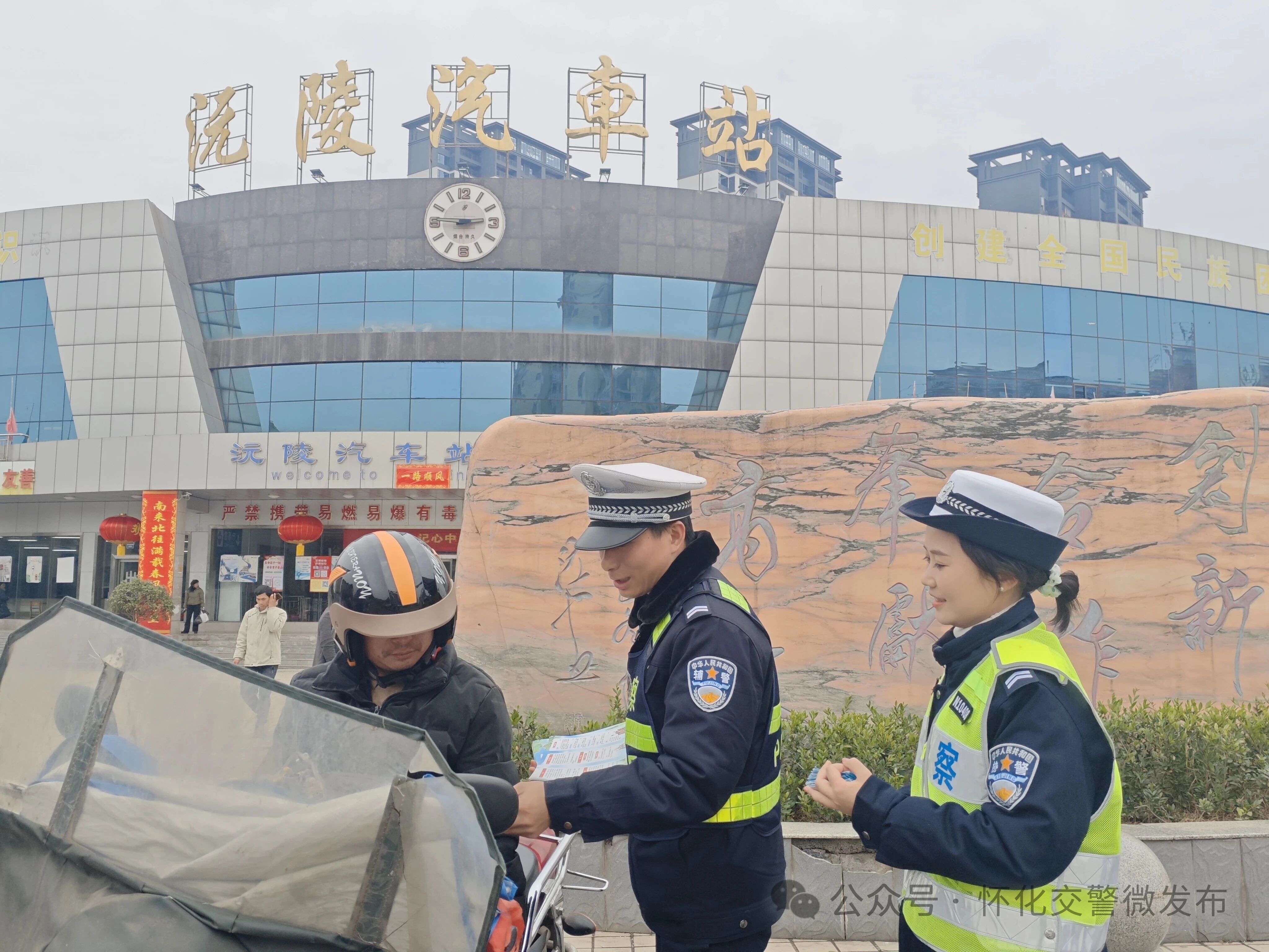 在严格执法的同时,交管部门将安全提示与便民服务融入工作全程。各执勤点民警在检查车辆时,同步开展安全叮嘱,提醒驾驶人切勿疲劳驾驶、超速超员,长途行车注意休息,并反复提醒所有驾乘人员全程系好安全带。国际陆港大队深入五桥春运执勤点开展“平安春运 交警同行”交通安全主题宣传活动,对客运车、摩电等车辆驾乘人员发放宣传资料,提醒驾驶员切勿疲劳驾驶、超速行驶,提醒乘客系好安全带,做好安全防护。洪江市大队深入岩垅镇集市,在开展宣传的同时,向群众赠送安全头盔50顶,切实提升群众出行安全防护水平。溆浦大队联合团委、公益组织,为新就业群体子女开设寒假交通安全“必修课”,通过社会联动体现人文关怀,延伸了服务触角。新晃大队深入新晃县春运交通安全检查服务站对客运车车辆驾乘人员发放宣传资料,提醒驾驶员切勿疲劳驾驶、超速行驶,提醒乘客系好安全带,做好安全防护。
