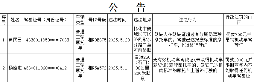 下列道路交通违法行为人(详细名单以及交通违法的事实、处罚种类、罚款金额等相关内容附后),因涉嫌实施了驾驶拼装或者达到报废标准的机动车上道路行驶等道路交通安全违法行为,其行为违反了《中华人民共和国道路交通安全法》第14条等交通法律法规,根据《中华人民共和国道路交通安全法》第100条第1款、第2款以及《湖南省实施<中华人民共和国道路交通安全法>办法》第61条第7项等规定,拟应依法给予罚款并吊销机动车驾驶证的行政处罚。因道路交通违法行为人无正当理由未在法定期限内来我大队接受处理,且经我队采取电话、邮寄、公告等方式依法告知,在告知期满后三十日内仍未来我队接受处理。现依据《湖南省实施<中华人民共和国道路交通安全法>办法》第46条第2款的规定,我队依法予以公告,公告期为七日。请以下道路交通违法行为人在公告期内及时来我大队(地址:怀化市鹤城区迎丰中路太平桥)接受处理,如有异议有权提出陈述和申辩,处吊销机动车驾驶证或者单笔罚款金额超过二千元的处罚还可申请听证。逾期,我队将依法作出行政处罚决定。