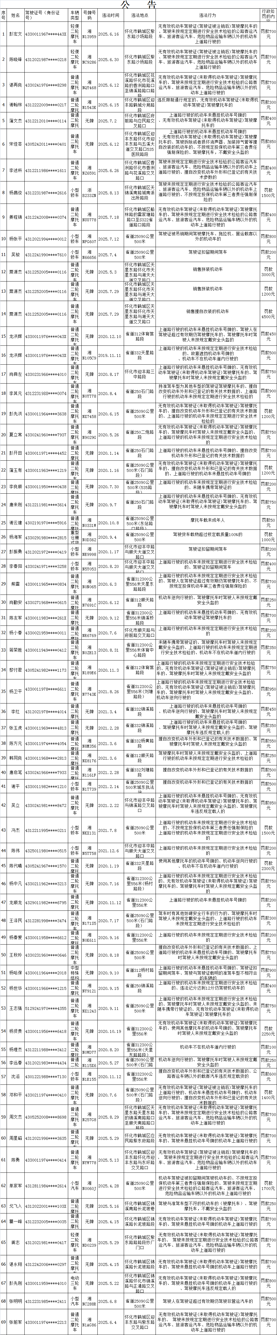 下列道路交通违法行为人(附名单以及交通违法的事实、法律依据、处罚种类、罚款金额等相关内容),因涉嫌实施了附后所列举的道路交通安全违法行为,根据《中华人民共和国道路交通安全法》等法律法规,拟应依法给予相应的行政处罚。因道路交通违法行为人无正当理由未在法定期限内来我大队接受处理,且经我队采取电话、邮寄、公告等方式依法告知,在告知期满后三十日内仍未来我队接受处理。现依据《湖南省实施<中华人民共和国道路交通安全法>办法》第46条第2款的规定,我队依法予以公告,公告期为七日。请以下道路交通违法行为人在公告期内及时来我大队(地址:怀化市鹤城区迎丰中路太平桥)接受处理,如有异议有权提出陈述和申辩,处吊销机动车驾驶证或者单笔罚款金额超过二千元的处罚还可申请听证。逾期,我队将依法作出行政处罚决定。