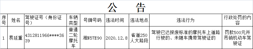 下列道路交通违法行为人(详细名单以及交通违法的事实、处罚种类、罚款金额等相关内容附后),因涉嫌实施了驾驶拼装或者达到报废标准的机动车上道路行驶等道路交通安全违法行为,其行为违反了《中华人民共和国道路交通安全法》第14条等交通法律法规,根据《中华人民共和国道路交通安全法》第100条第1款、第2款以及《湖南省实施<中华人民共和国道路交通安全法>办法》第61条第7项等规定,拟应依法给予罚款并吊销机动车驾驶证的行政处罚。因道路交通违法行为人无正当理由未在法定期限内来我大队接受处理,且经我队依法邮寄告知书被退回,现依据《湖南省实施<中华人民共和国道路交通安全法>办法》第46条第2款、《中华人民共和国民事诉讼法》第95条等法律规定,我队在此采取公告方式依法予以告知,本公告期为三十日。请以下道路交通违法行为人在公告期内以及公告期满后三十日内到我大队(地址:怀化市鹤城区迎丰中路太平桥)接受处理,如有异议有权提出陈述和申辩,处吊销机动车驾驶证或者单笔罚款金额超过二千元的处罚还可申请听证。逾期,我队将继续依照法定程序办案。