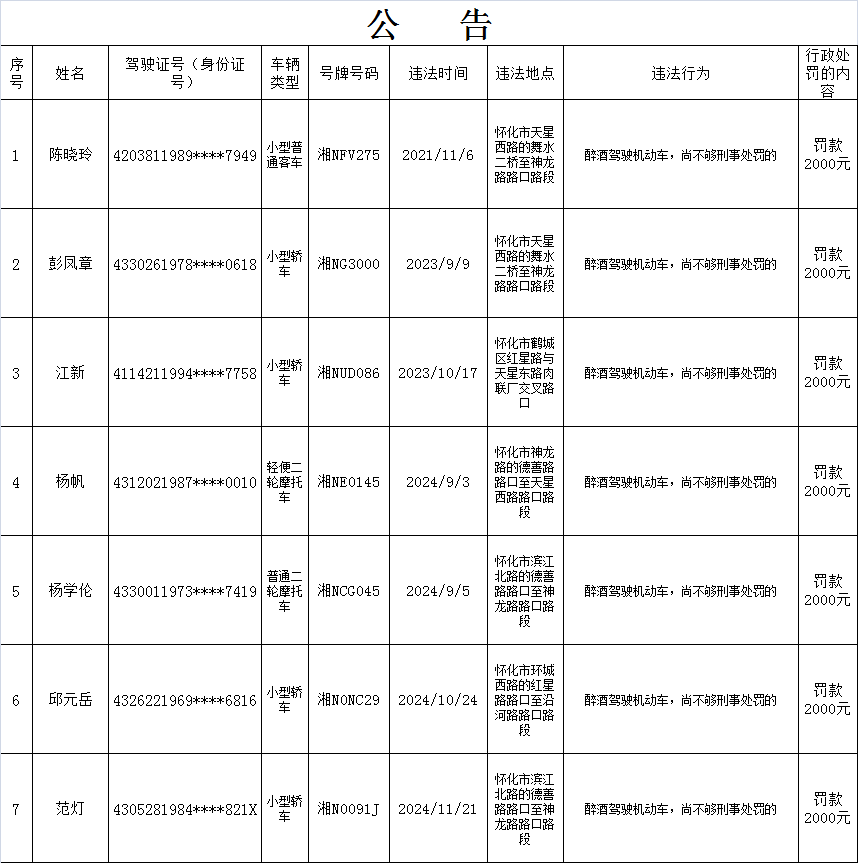 下列道路交通违法行为人(详细名单以及交通违法的事实、处罚种类、罚款金额等相关内容附后),因涉嫌实施了饮酒后驾驶机动车上道路行驶等道路交通安全违法行为,其行为违反了《中华人民共和国道路交通安全法》第22条第2款等法律法规,依据《中华人民共和国道路交通安全法》第91条等规定,拟应依法给予暂扣机动车驾驶证六个月并处罚款的行政处罚。因道路交通违法行为人无正当理由未在法定期限内来我大队接受处理,且经我队依法邮寄告知书被退回,现依据《湖南省实施<中华人民共和国道路交通安全法>办法》第46条第2款、《中华人民共和国民事诉讼法》第95条等法律规定,我队在此采取公告方式依法予以告知,本公告期为三十日。请以下道路交通违法行为人在公告期内以及公告期满后三十日内到我大队(地址:怀化市河西南山寨路1号)接受处理,如有异议有权提出陈述和申辩,处吊销机动车驾驶证或者单笔罚款金额超过二千元的处罚还可申请听证。逾期,我队将继续依照法定程序办案。