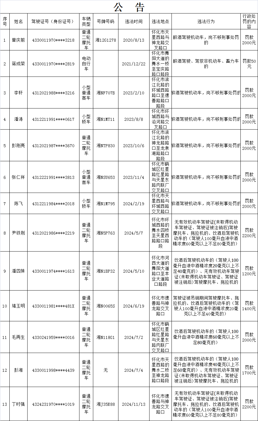 下列道路交通违法行为人(详细名单以及交通违法的事实、处罚种类、罚款金额等相关内容附后),因涉嫌实施了饮酒后驾驶机动车上道路行驶等道路交通安全违法行为,其行为违反了《中华人民共和国道路交通安全法》第22条第2款等法律法规,依据《中华人民共和国道路交通安全法》第91条等规定,拟应依法给予暂扣机动车驾驶证六个月并处罚款的行政处罚。因道路交通违法行为人无正当理由未在法定期限内来我大队接受处理,且经我队采取电话、邮寄、公告等方式依法告知,在告知期满后三十日内仍未来我队接受处理。现依据《湖南省实施<中华人民共和国道路交通安全法>办法》第46条第2款的规定,我队依法予以公告,公告期为七日。请以下道路交通违法行为人在公告期内及时来我大队(地址:怀化市河西南山寨路1号)接受处理,如有异议有权提出陈述和申辩,处吊销机动车驾驶证或者单笔罚款金额超过二千元的处罚还可申请听证。逾期,我队将依法作出行政处罚决定。