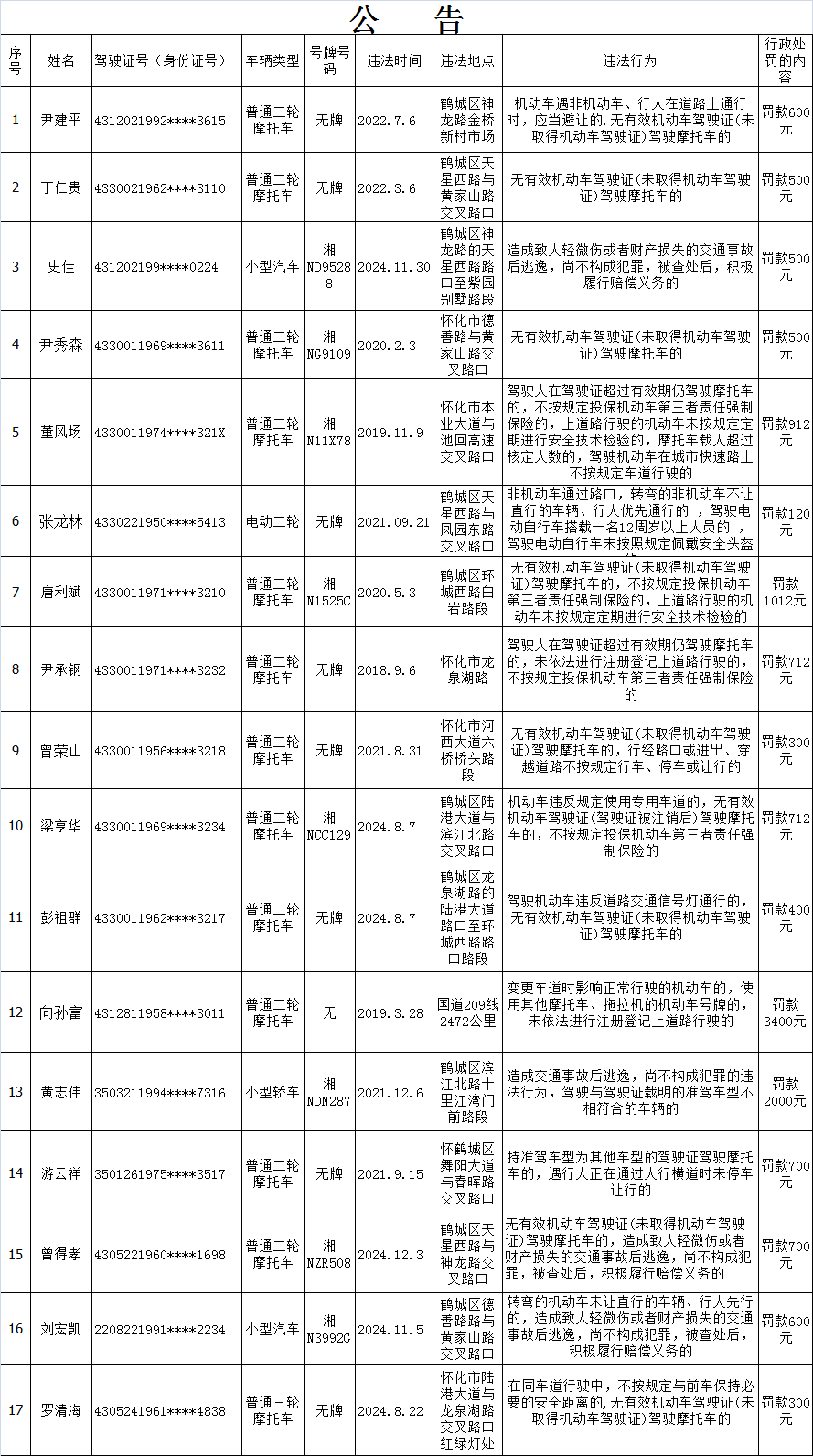 下列道路交通违法行为人(附名单以及交通违法的事实、法律依据、处罚种类、罚款金额等相关内容),因涉嫌实施了附后所列举的道路交通安全违法行为,根据《中华人民共和国道路交通安全法》等法律法规,拟应依法给予相应的行政处罚。因道路交通违法行为人无正当理由未在法定期限内来我大队接受处理,且经我队依法邮寄告知书被退回,现依据《湖南省实施<中华人民共和国道路交通安全法>办法》第46条第2款、《中华人民共和国民事诉讼法》第95条等法律规定,我队在此采取公告方式依法予以告知,本公告期为三十日。请以下道路交通违法行为人在公告期内以及公告期满后三十日内到我大队(地址:怀化市河西南山寨路1号)接受处理,如有异议有权提出陈述和申辩,处吊销机动车驾驶证或单笔罚款金额超过二千元的处罚还可申请听证。逾期,我队将继续依照法定程序办案。