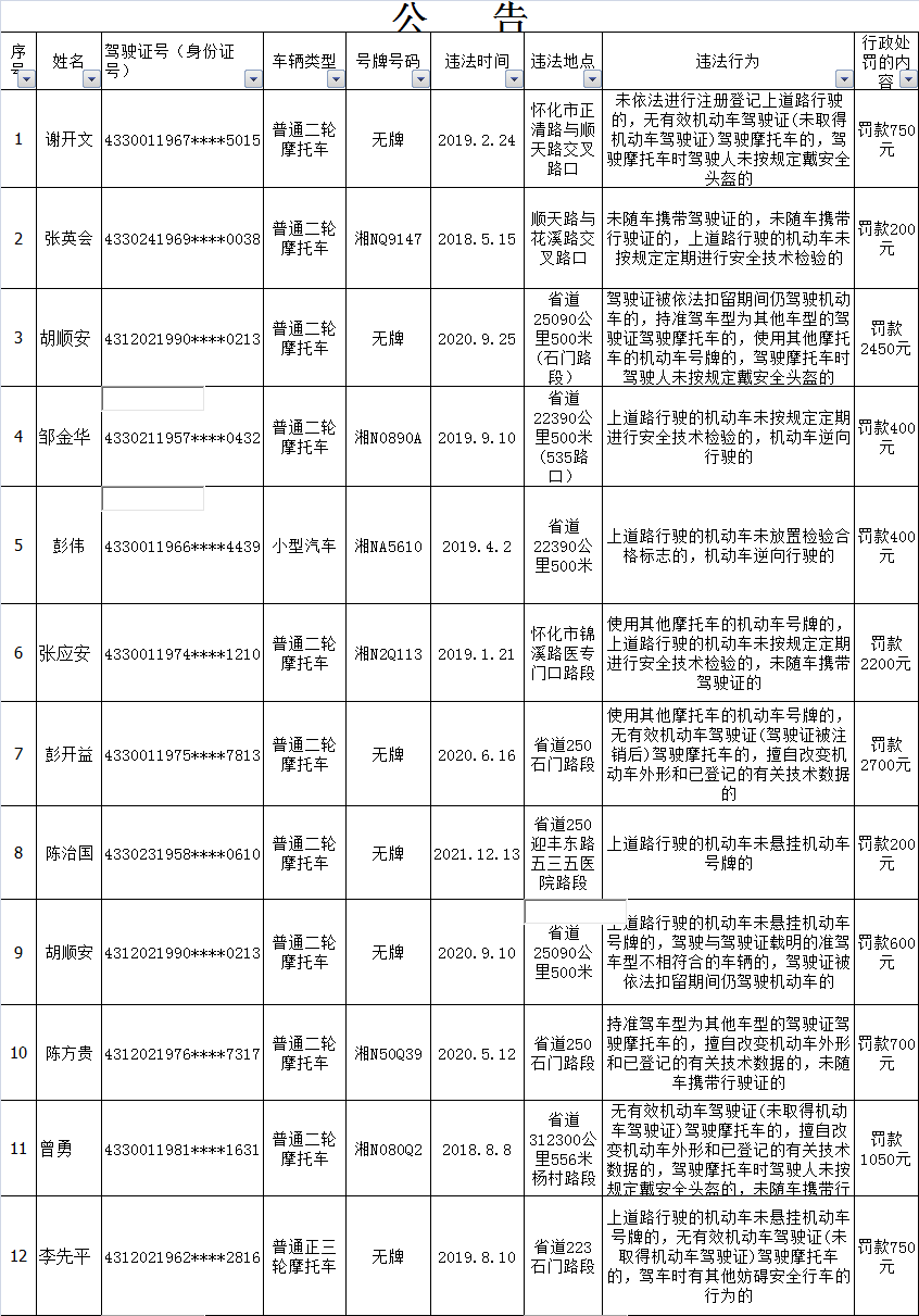 下列道路交通违法行为人(附名单以及交通违法的事实、法律依据、处罚种类、罚款金额等相关内容),因涉嫌实施了附后所列举的道路交通安全违法行为,根据《中华人民共和国道路交通安全法》等法律法规,拟应依法给予相应的行政处罚。因道路交通违法行为人无正当理由未在法定期限内来我大队接受处理,且经我队依法邮寄告知书被退回,现依据《湖南省实施<中华人民共和国道路交通安全法>办法》第46条第2款、《中华人民共和国民事诉讼法》第95条等法律规定,我队在此采取公告方式依法予以告知,本公告期为三十日。请以下道路交通违法行为人在公告期内以及公告期满后三十日内到我大队(地址:怀化市鹤城区迎丰中路太平桥)接受处理,如有异议有权提出陈述和申辩,处吊销机动车驾驶证或单笔罚款金额超过二千元的处罚还可申请听证。逾期,我队将继续依照法定程序办案。