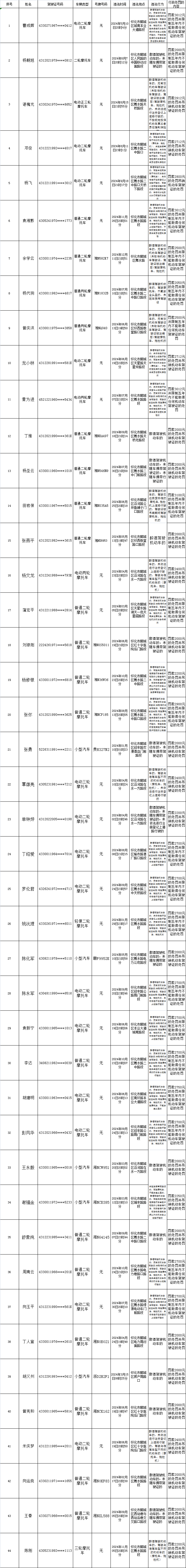 下列道路交通违法行为人(附名单以及交通违法的事实、法律依据、处罚种类、罚款金额等相关内容),因涉嫌实施了附后所列举的道路交通安全违法行为,根据《中华人民共和国道路交通安全法》等法律法规,拟应依法给予相应的行政处罚。因道路交通违法行为人无正当理由未在法定期限内来我大队接受处理,且经我队依法邮寄告知书被退回,现依据《湖南省实施<中华人民共和国道路交通安全法>办法》第46条第2款、《中华人民共和国民事诉讼法》第95条等法律规定,我队在此采取公告方式依法予以告知,本公告期为三十日。请以下道路交通违法行为人在公告期内以及公告期满后三十日内到我大队(地址:怀化市北环路501号)接受处理,如有异议有权提出陈述和申辩,处吊销机动车驾驶证或单笔罚款金额超过二千元的处罚还可申请听证。逾期,我队将继续依照法定程序办案。