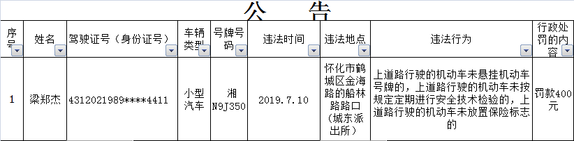 下列道路交通违法行为人(附名单以及交通违法的事实、法律依据、处罚种类、罚款金额等相关内容),因涉嫌实施了附后所列举的道路交通安全违法行为,根据《中华人民共和国道路交通安全法》等法律法规,拟应依法给予相应的行政处罚。因道路交通违法行为人无正当理由未在法定期限内来我大队接受处理,且经我队依法邮寄告知书被退回,现依据《湖南省实施<中华人民共和国道路交通安全法>办法》第46条第2款、《中华人民共和国民事诉讼法》第95条等法律规定,我队在此采取公告方式依法予以告知,本公告期为三十日。请以下道路交通违法行为人在公告期内以及公告期满后三十日内到我大队(地址:怀化市鹤城区迎丰中路太平桥)接受处理,如有异议有权提出陈述和申辩,处吊销机动车驾驶证或单笔罚款金额超过二千元的处罚还可申请听证。逾期,我队将继续依照法定程序办案。