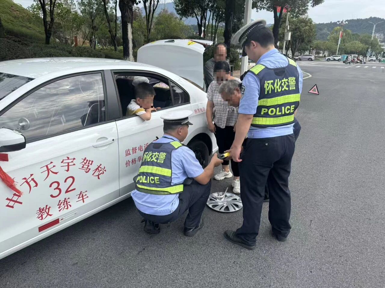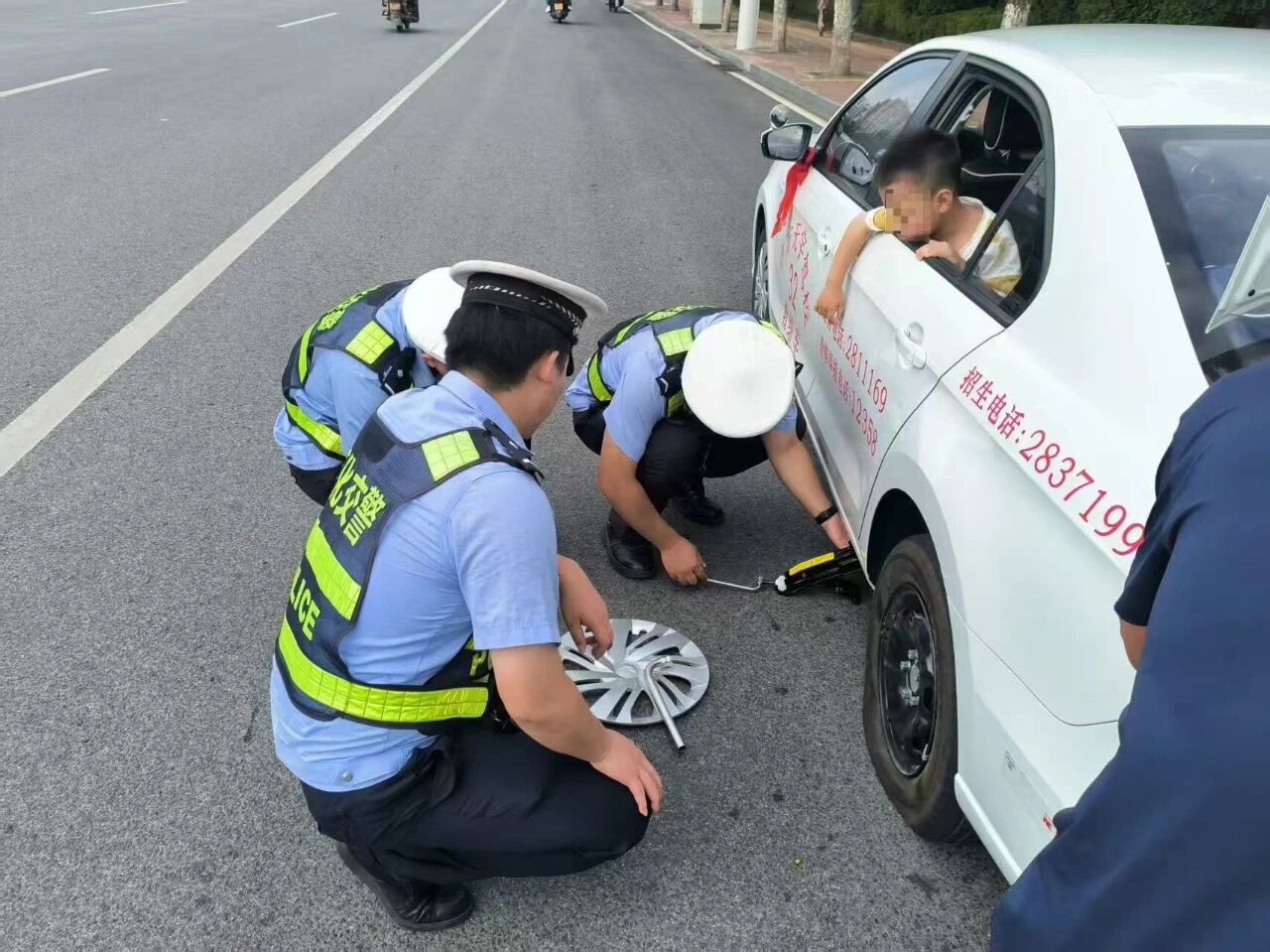 2025年10月1日下午,怀化交警机动勤务大队在辖区高铁站路段开展节日疏堵保畅时,发现一辆教练车停在路边,驾驶员站在车旁满脸焦虑,束手无策。民警立即上前询问,原来轮胎爆胎,驾驶员因不会更换而十分着急。经过十多分钟的努力,民警帮助驾驶员更换好轮胎后,对车辆进行二次安全检查,确保能安全上路,并叮嘱驾驶员以后行车前要仔细检查车辆状况,注意行车安全。驾驶员对民警的热情帮助非常感动,再三表示感谢。 国庆我在岗 是责任 是使命 更是坚守 怀化公安交警 将一如既往坚守岗位 为您的平安出行 保驾护航