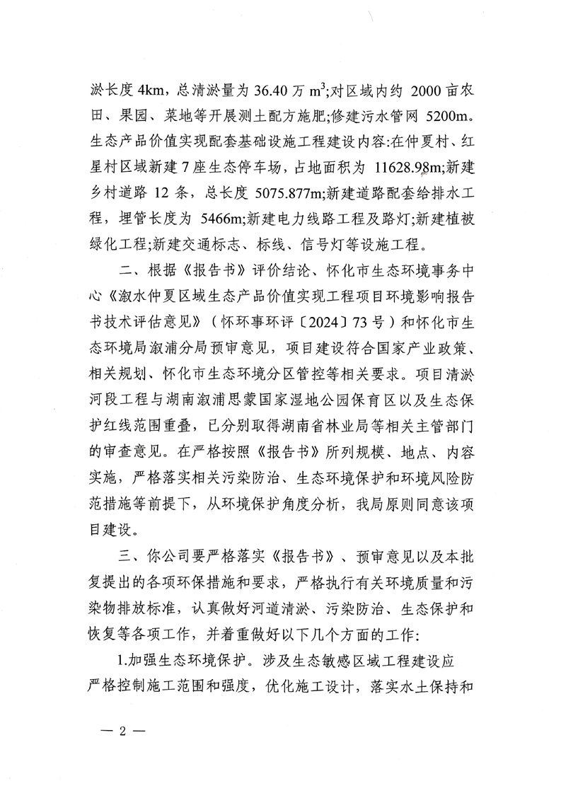 关于溆水仲夏区域生态产品价值实现工程项目环境影响报告书批复