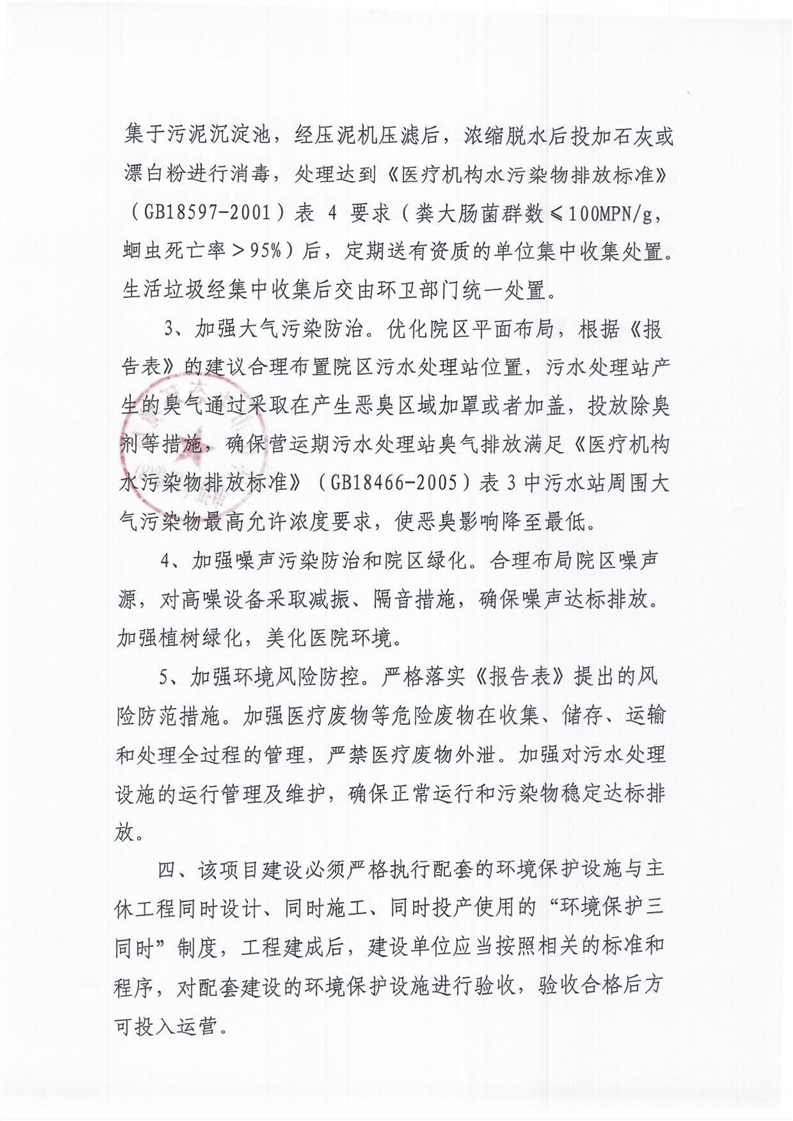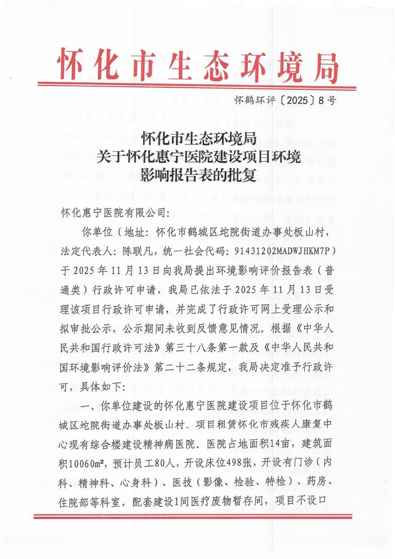 关于怀化惠宁医院建设项目环境影响报告表的批复