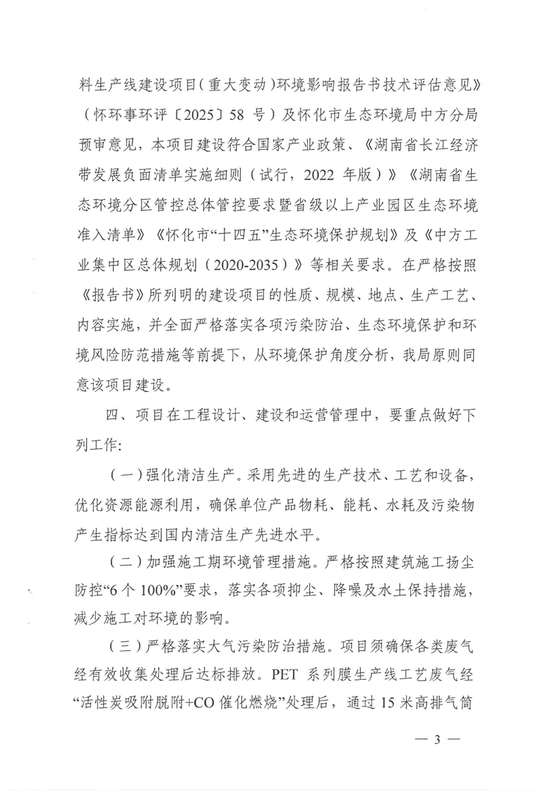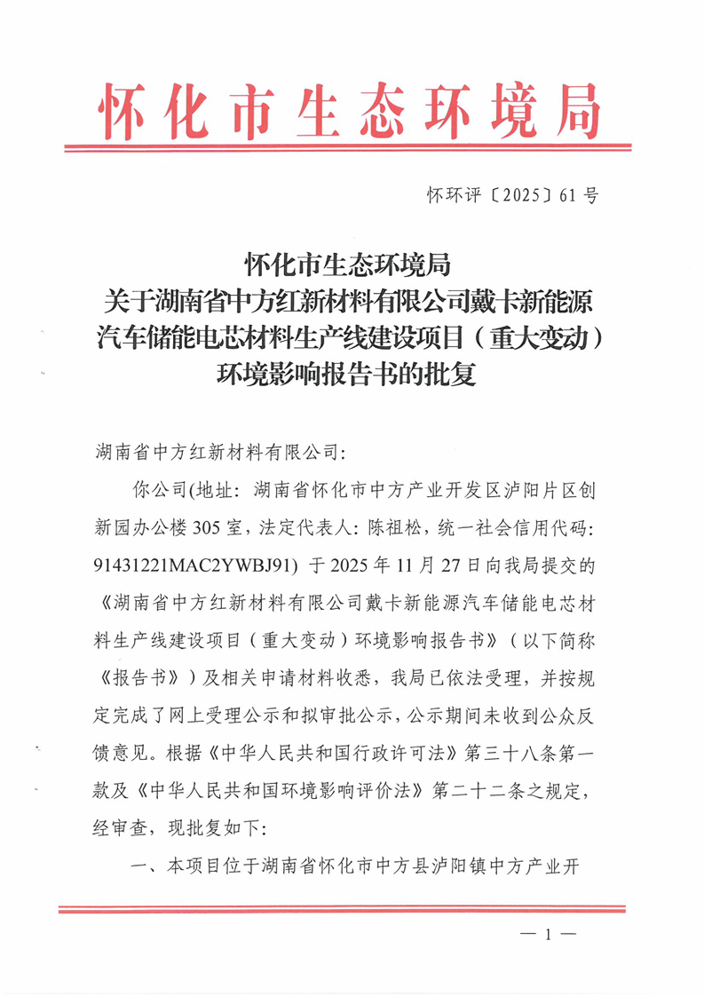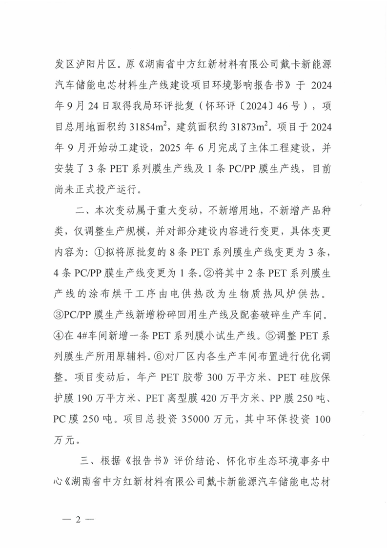 关于湖南省中方红新材料有限公司戴卡新能源汽车储能电芯材料生产线建设项目(重大变动)环境影响报告书的批复
