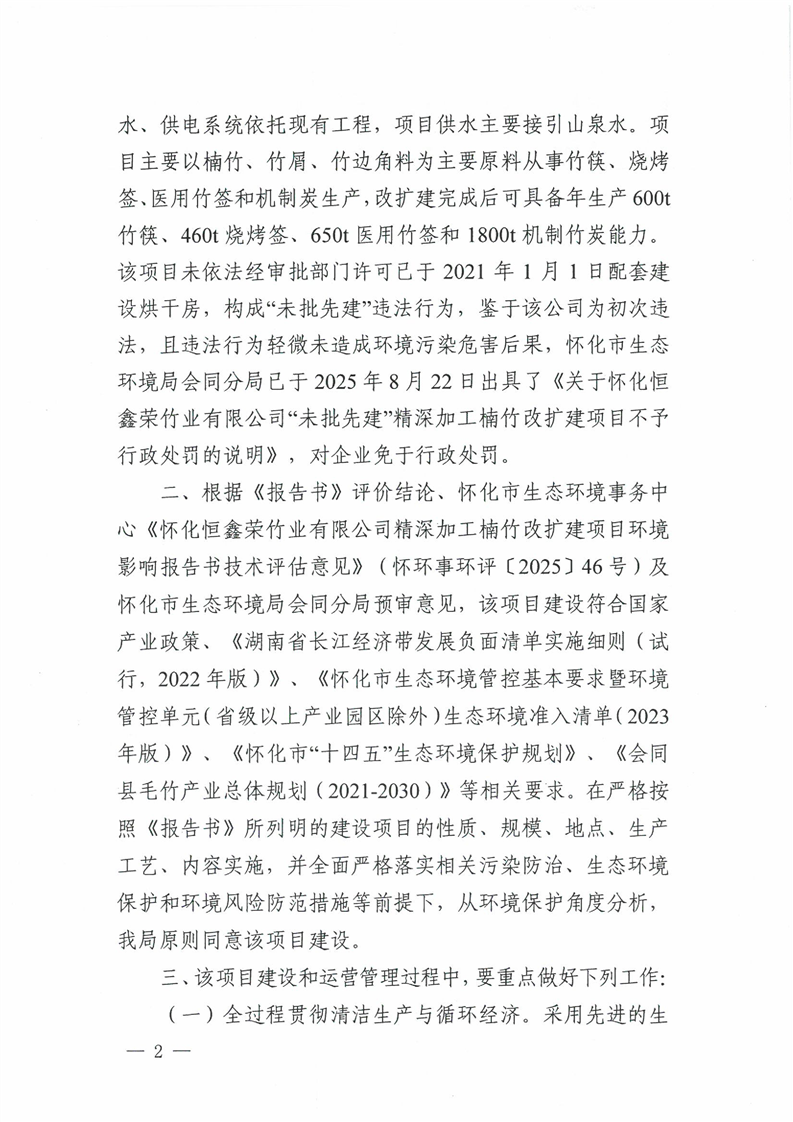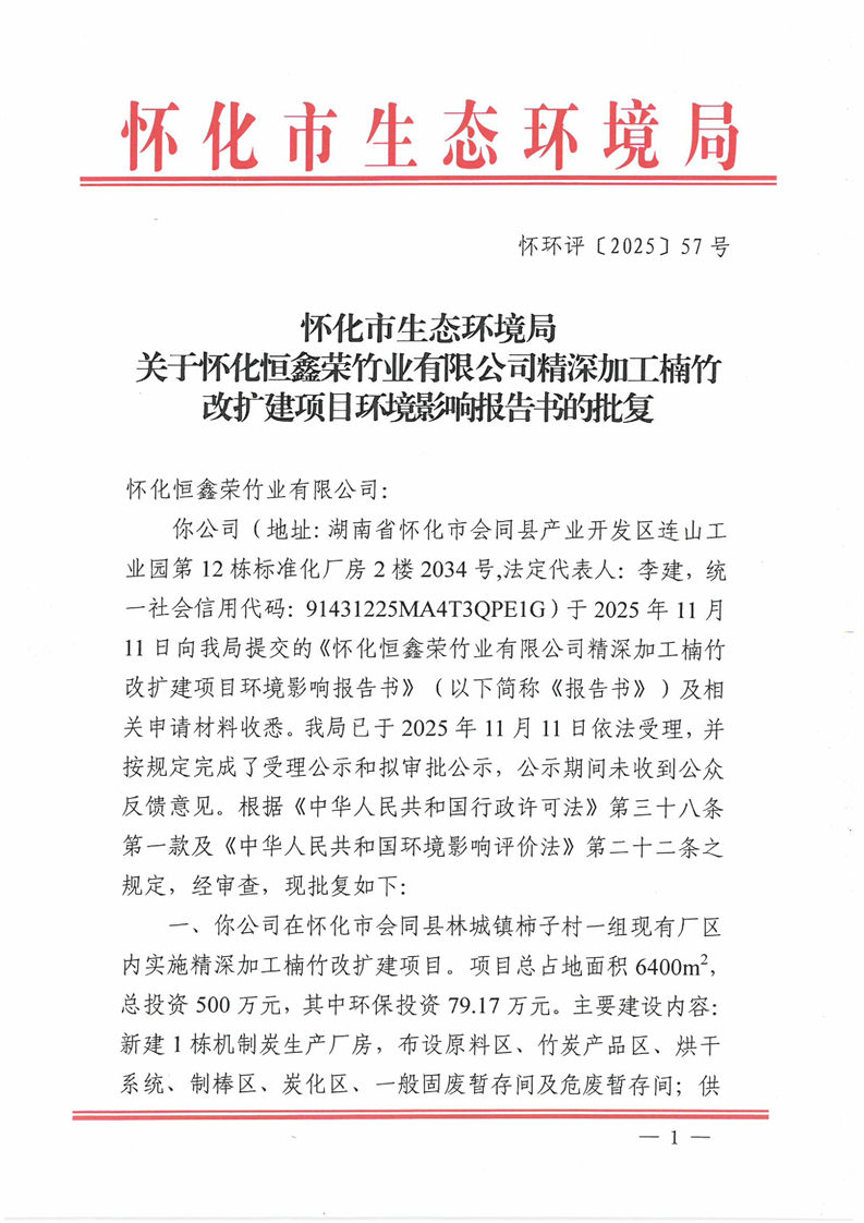 关于怀化恒鑫荣竹业有限公司精深加工楠竹改扩建项目环境影响报告书的批复