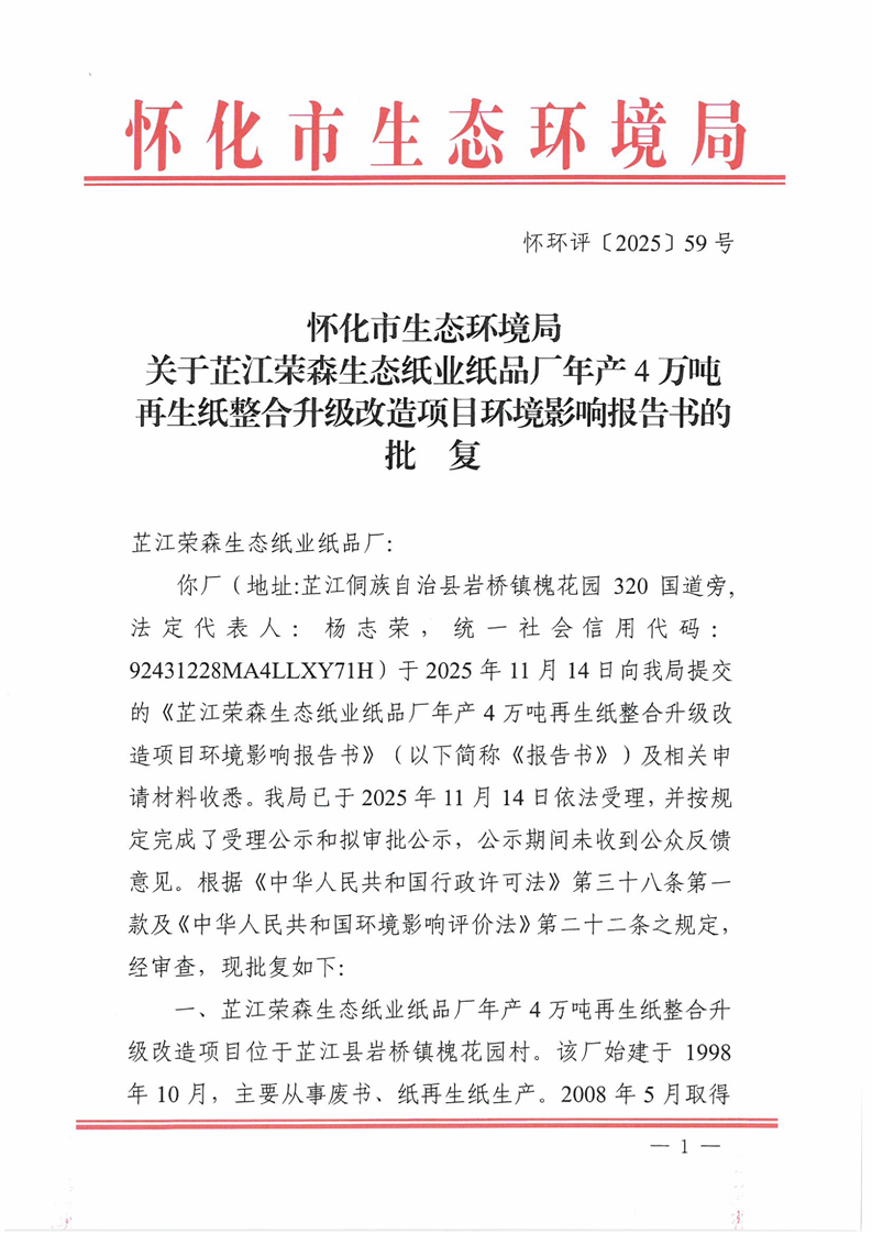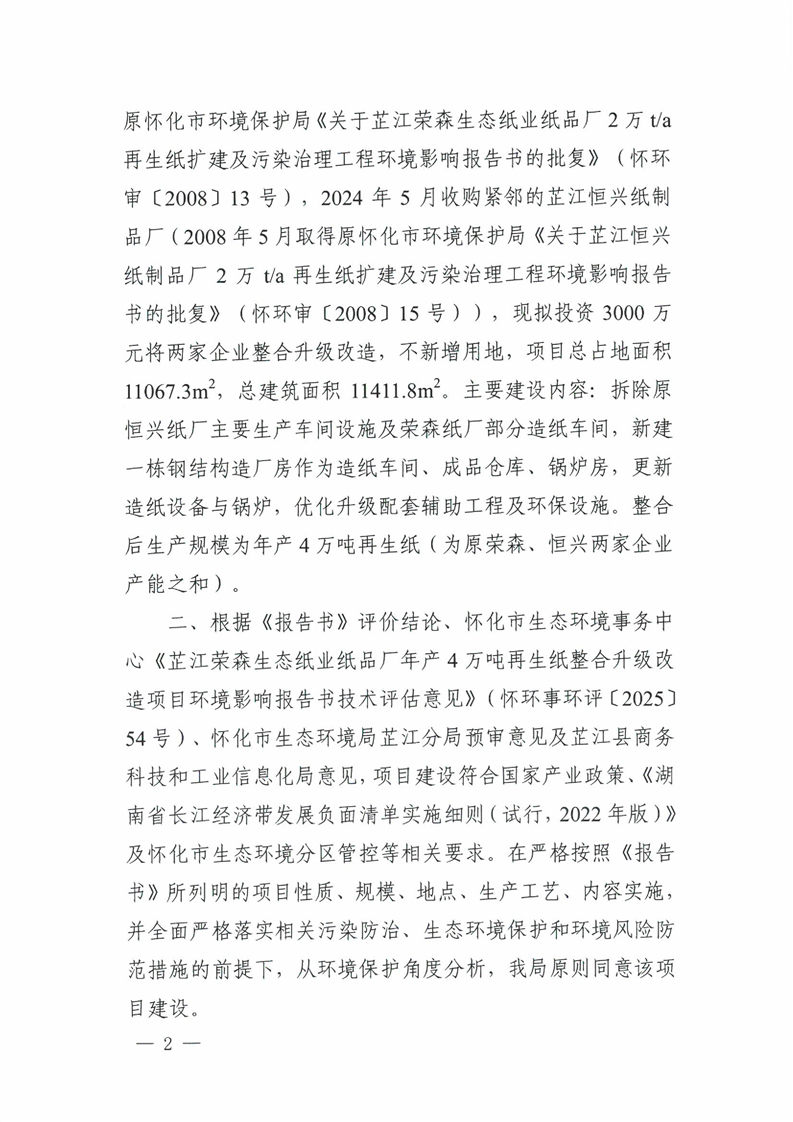 关于芷江荣森生态纸业纸品厂年产4万吨再生纸整合升级改造项目环境影响报告书的批复