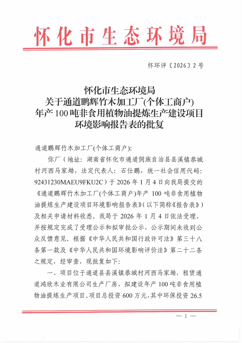 关于通道鹏辉竹木加工厂(个体工商户)年产 100 吨非食用植物油提炼生产建设项目环境影响报告表的批复