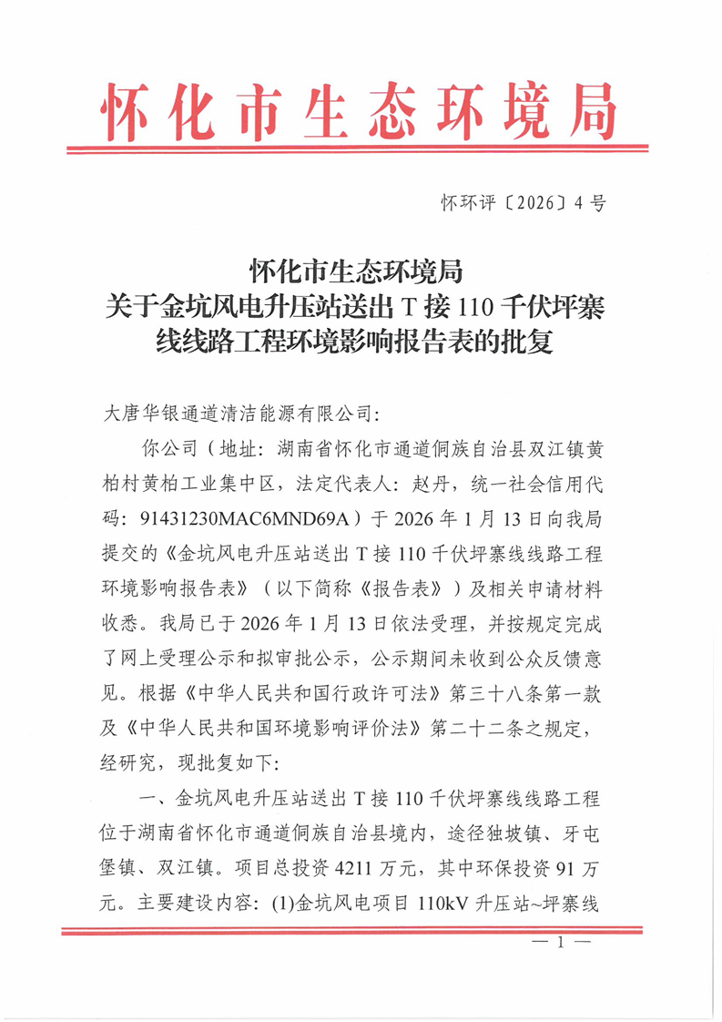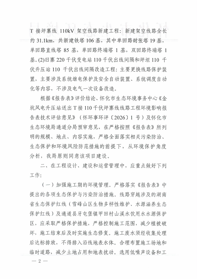 关于金坑风电升压站送出T 接110 千伏坪寨线线路工程环境影响报告表的批复
