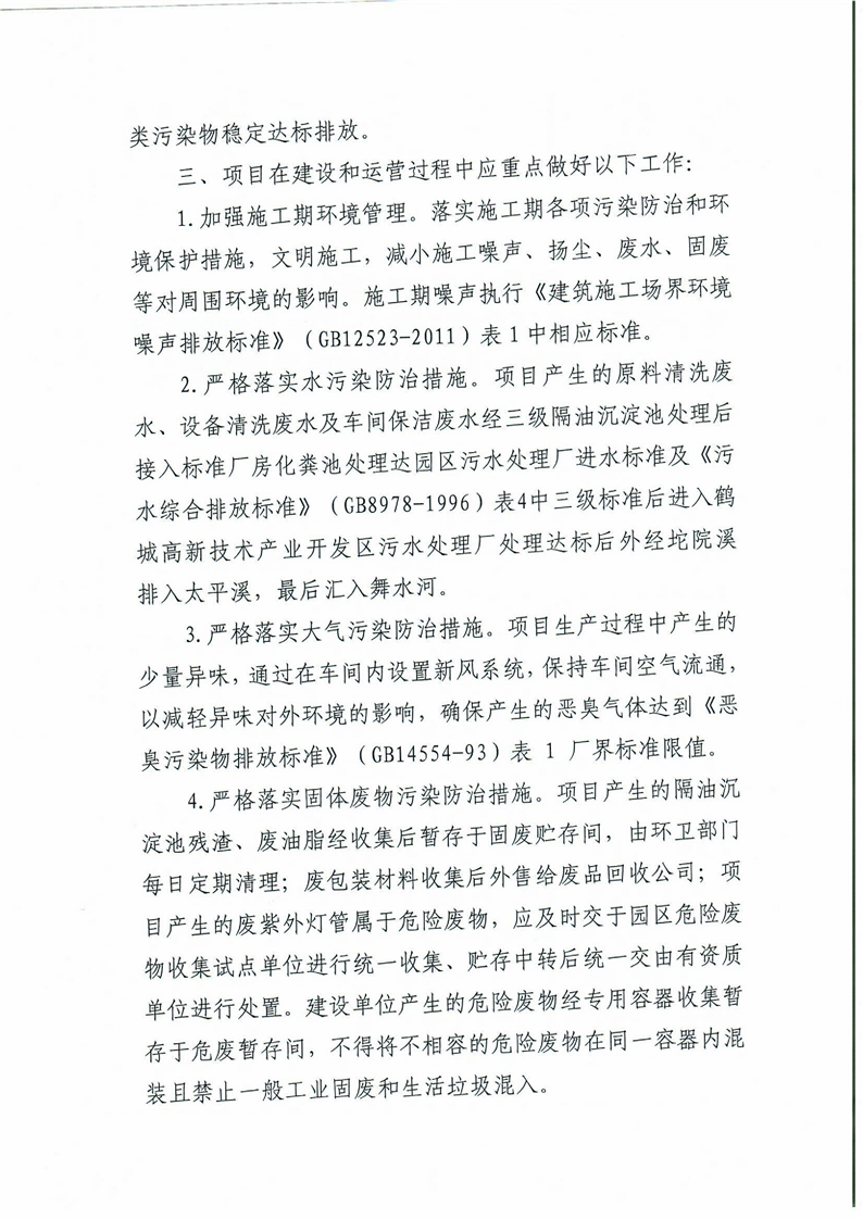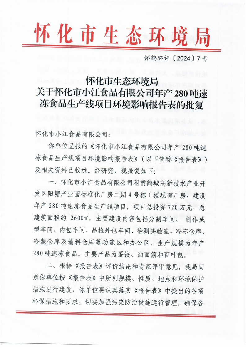 关于怀化市小江食品有限公司年产280吨速冻食品生产线项目环境影响报告表的批复