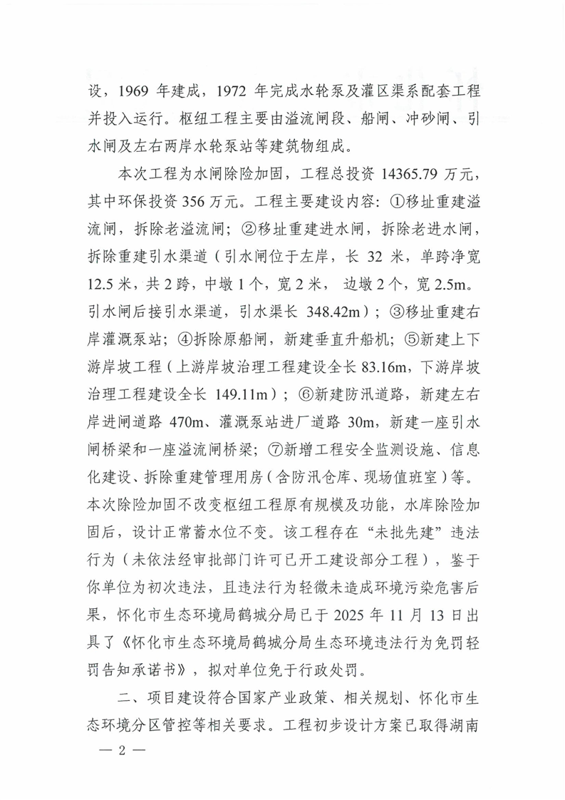 关于怀化市鹤城区红岩水闸除险加固工程环境影响报告书的批复