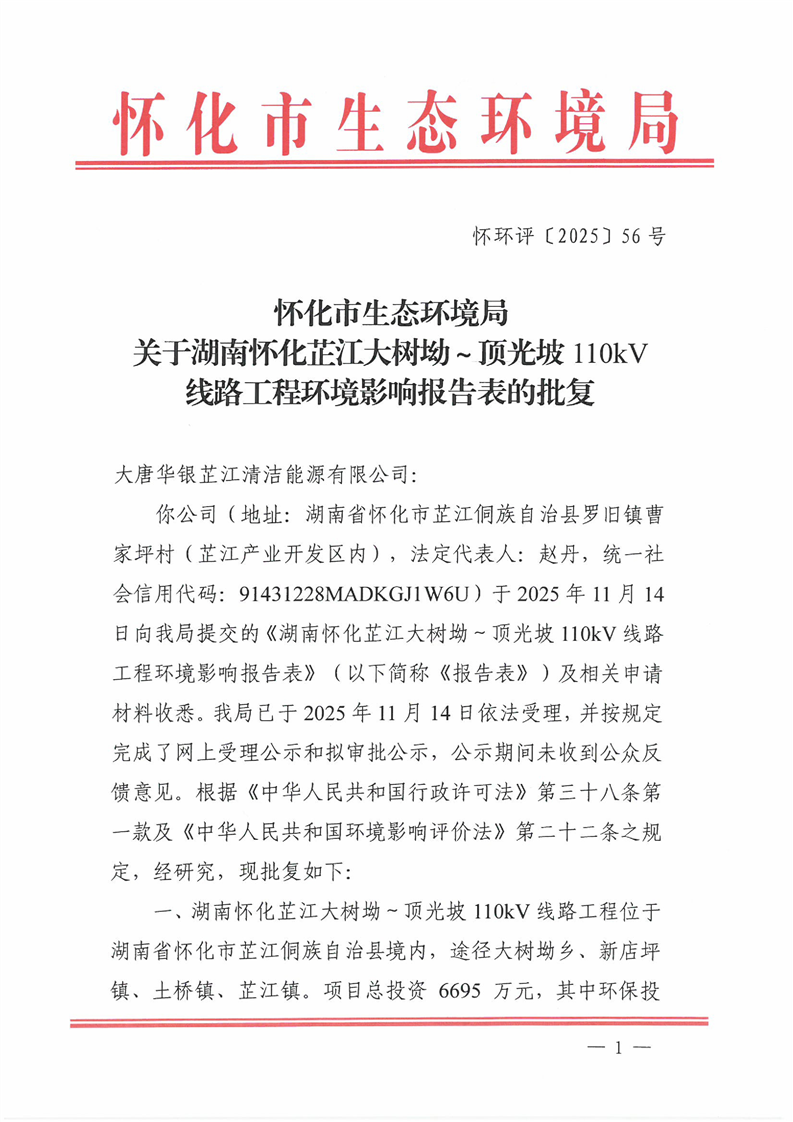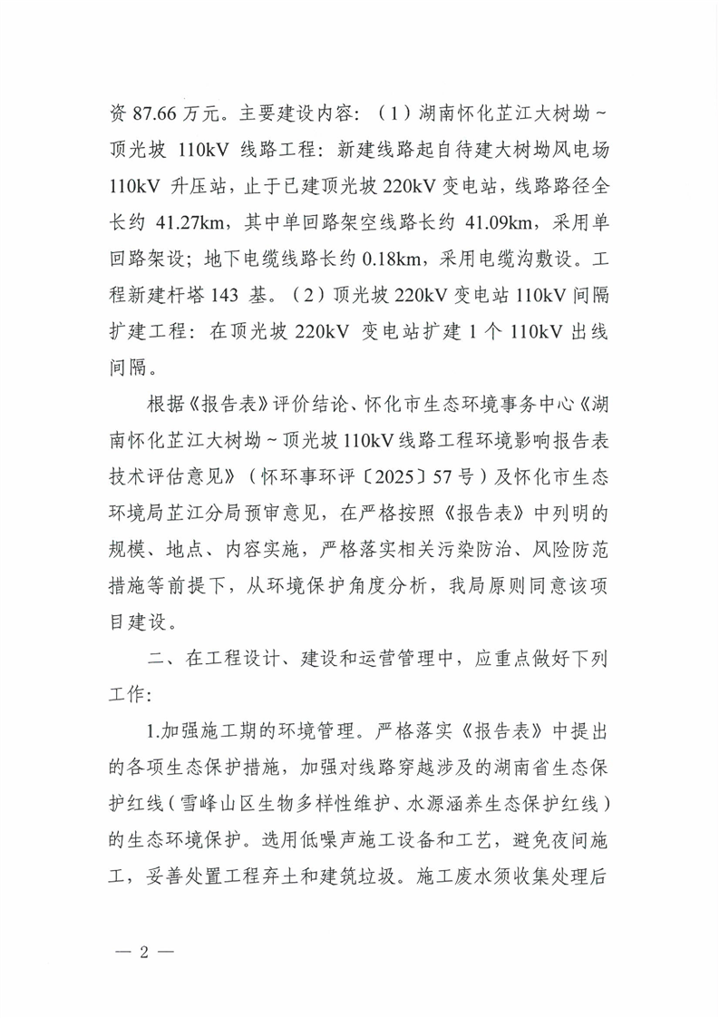 关于湖南怀化芷江大树坳~顶光坡110kV线路工程环境影响报告表的批复
