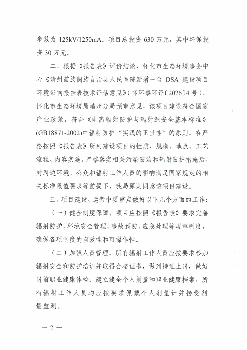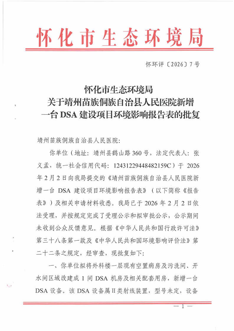 关于靖州苗族侗族自治县人民医院新增一台DSA建设项目环境影响报告表的批复