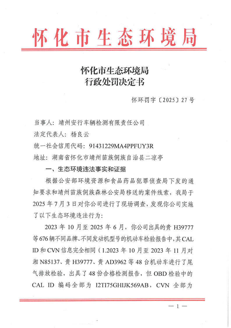 靖州安行车辆检测有限责任公司(怀环罚字〔2025〕27号)