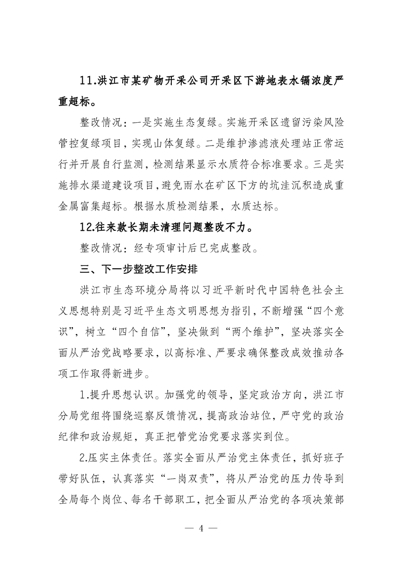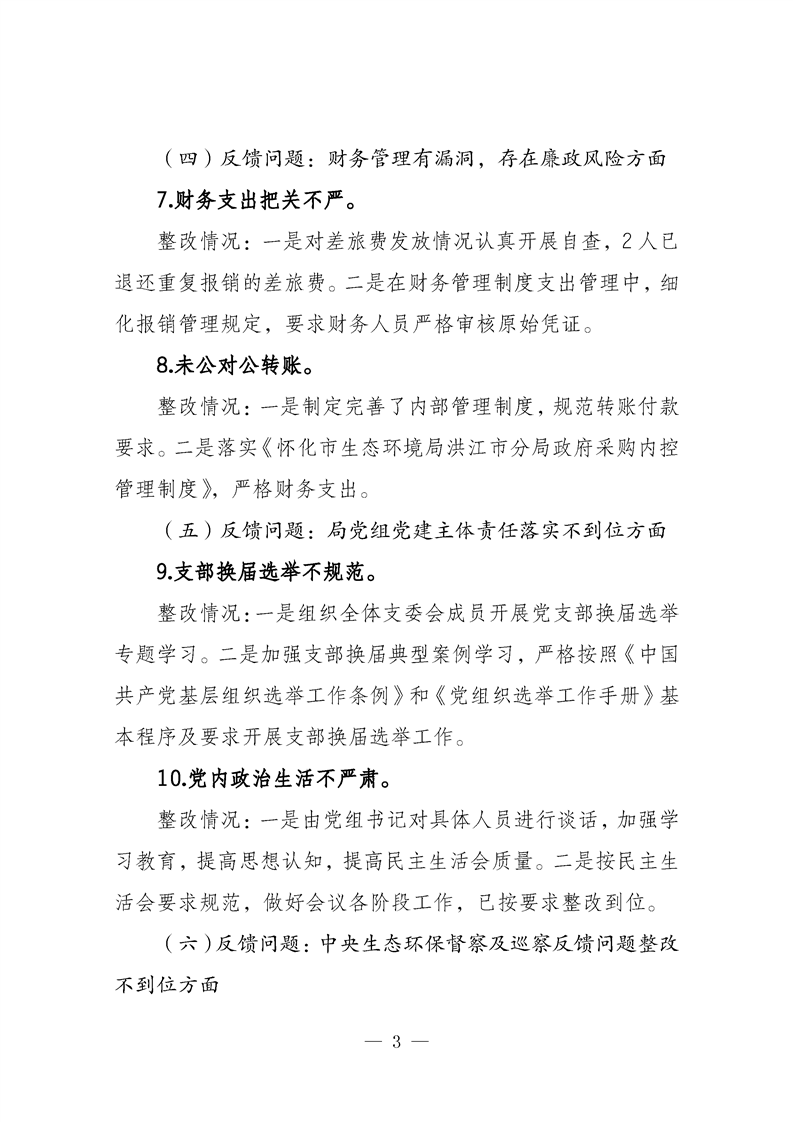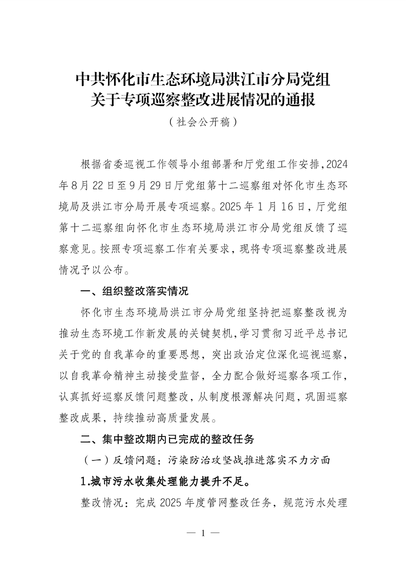 中共怀化市生态环境局洪江市分局党组关于专项巡察整改进展情况的通报