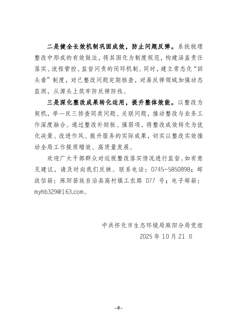 中共怀化市生态环境局麻阳分局党组关于专项巡察整改进展情况的通报