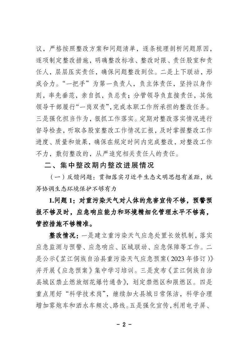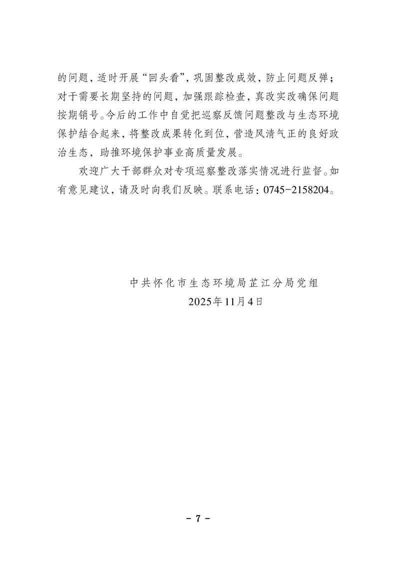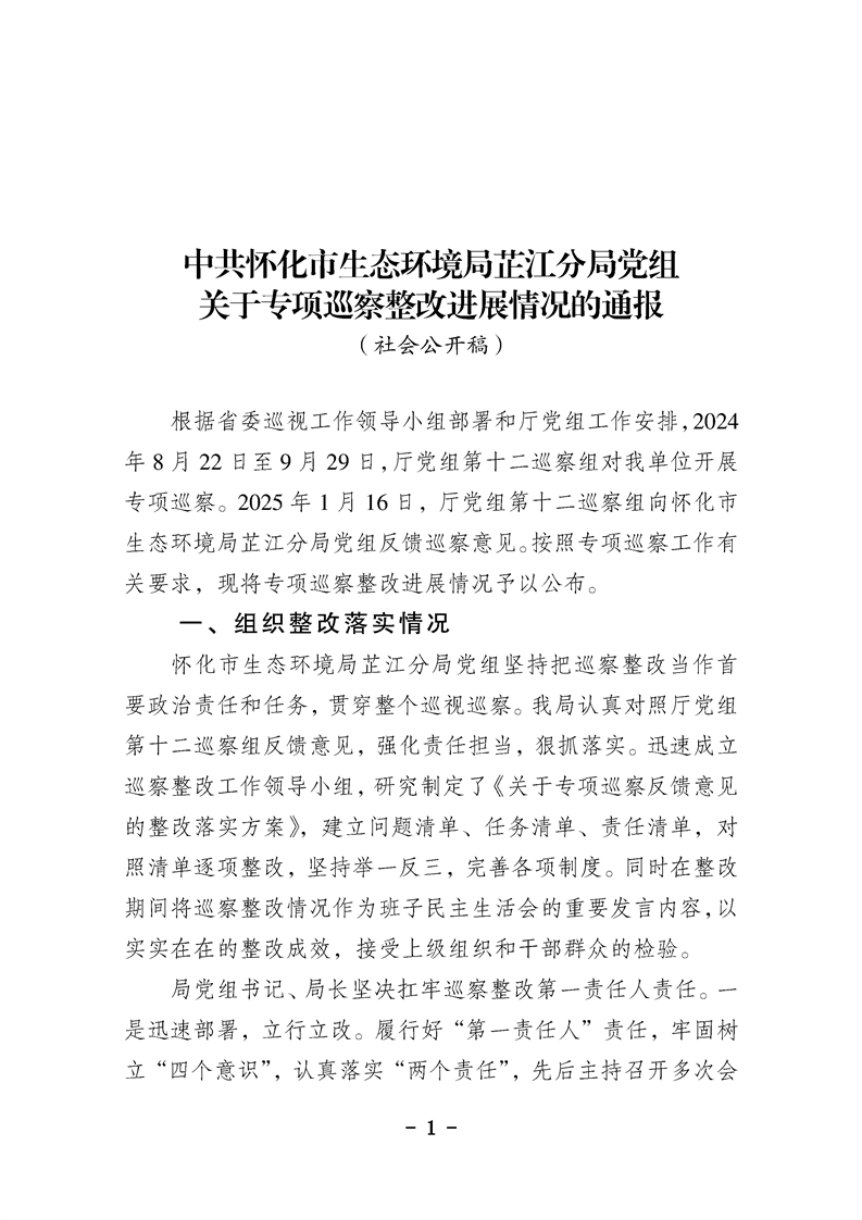 中共怀化市生态环境局芷江分局党组关于专项巡察整改进展情况的通报
