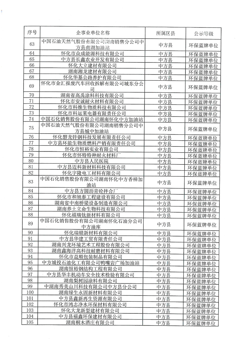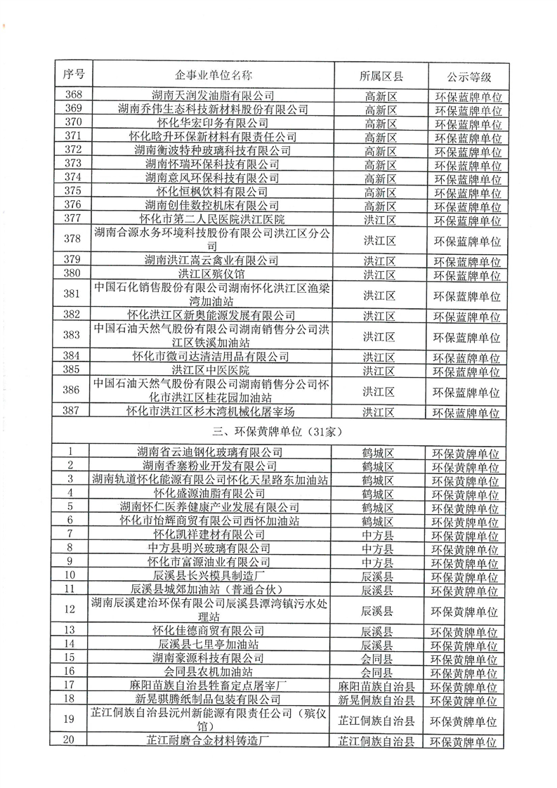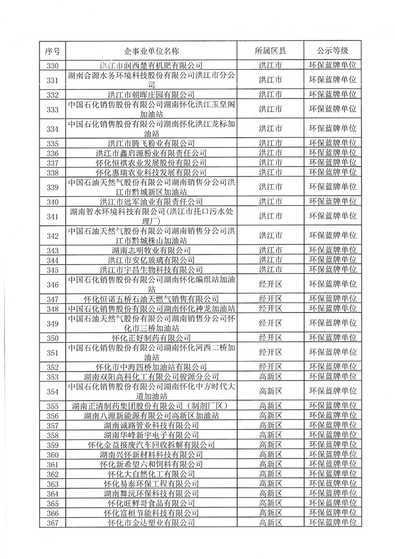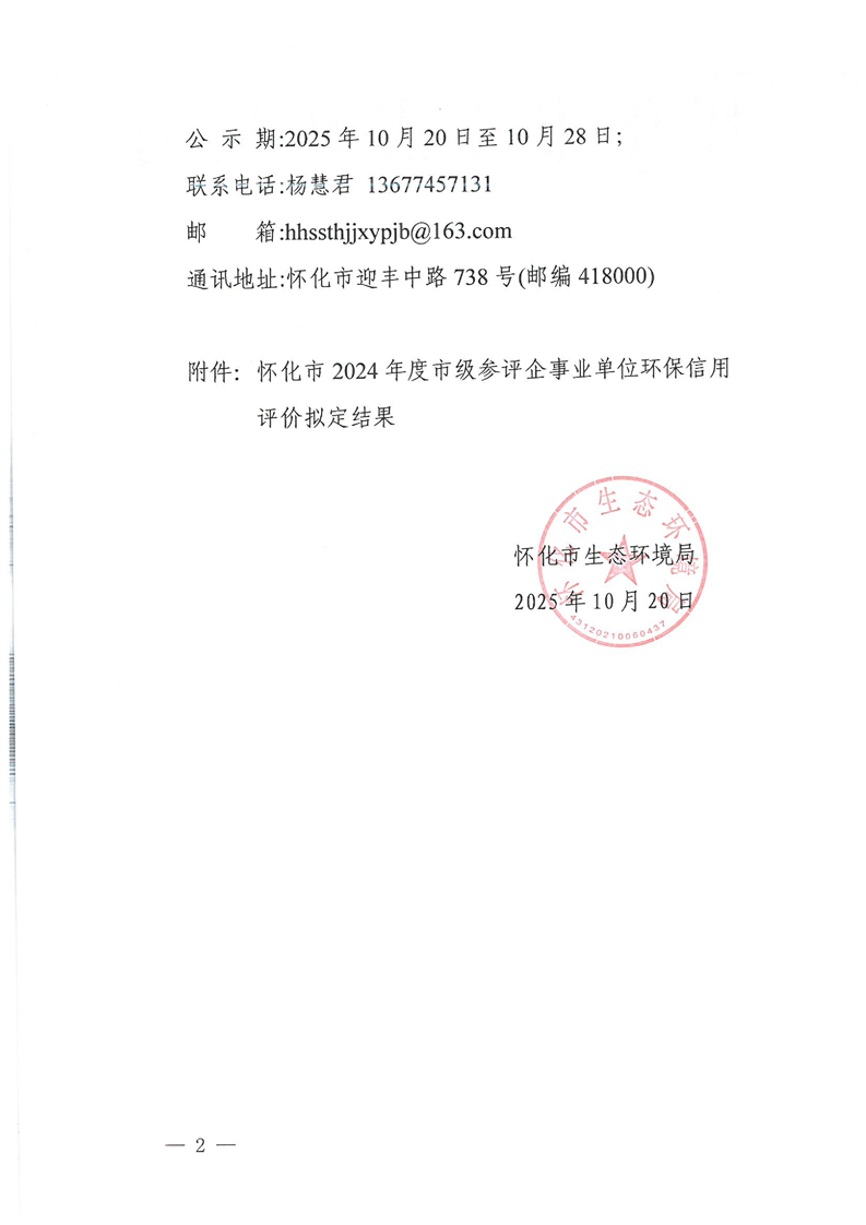 怀化市2024年度市级参评企事业单位环保信用评价拟定结果公示