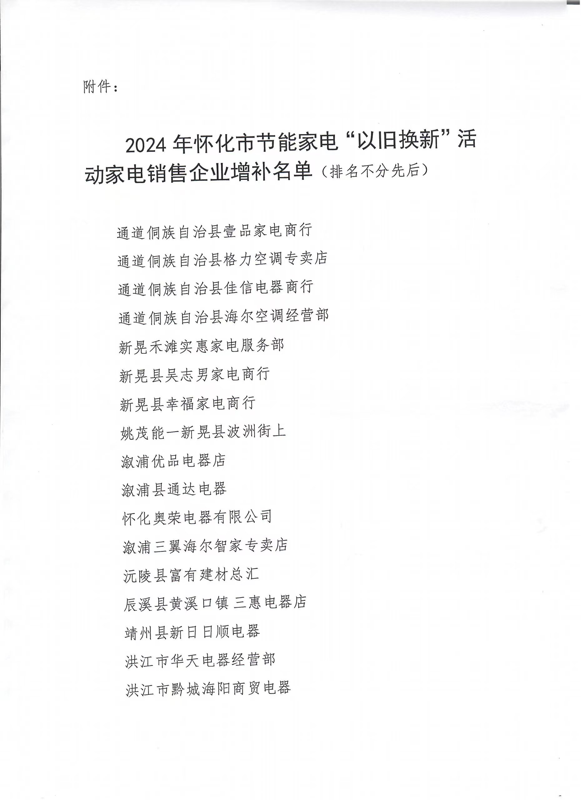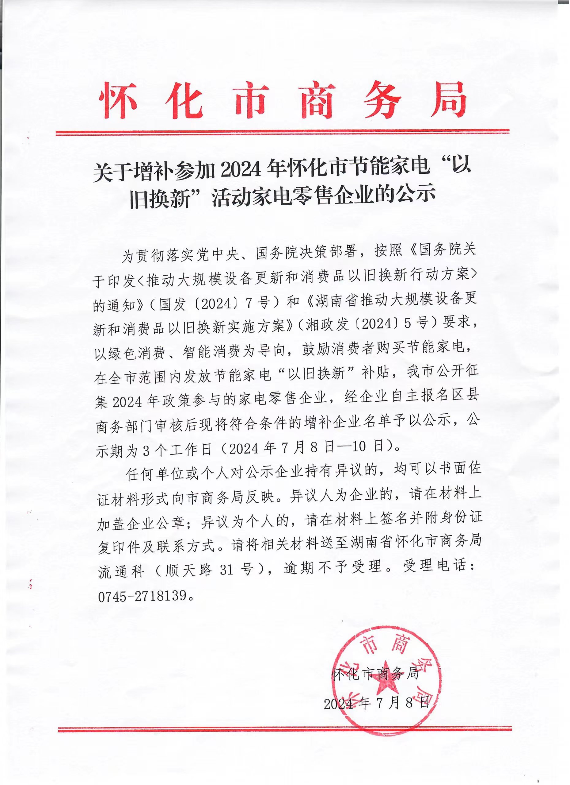 怀化市商务局关于增补参加2024年怀化市节能家电“以旧换新”活动家电零售企业的公示
